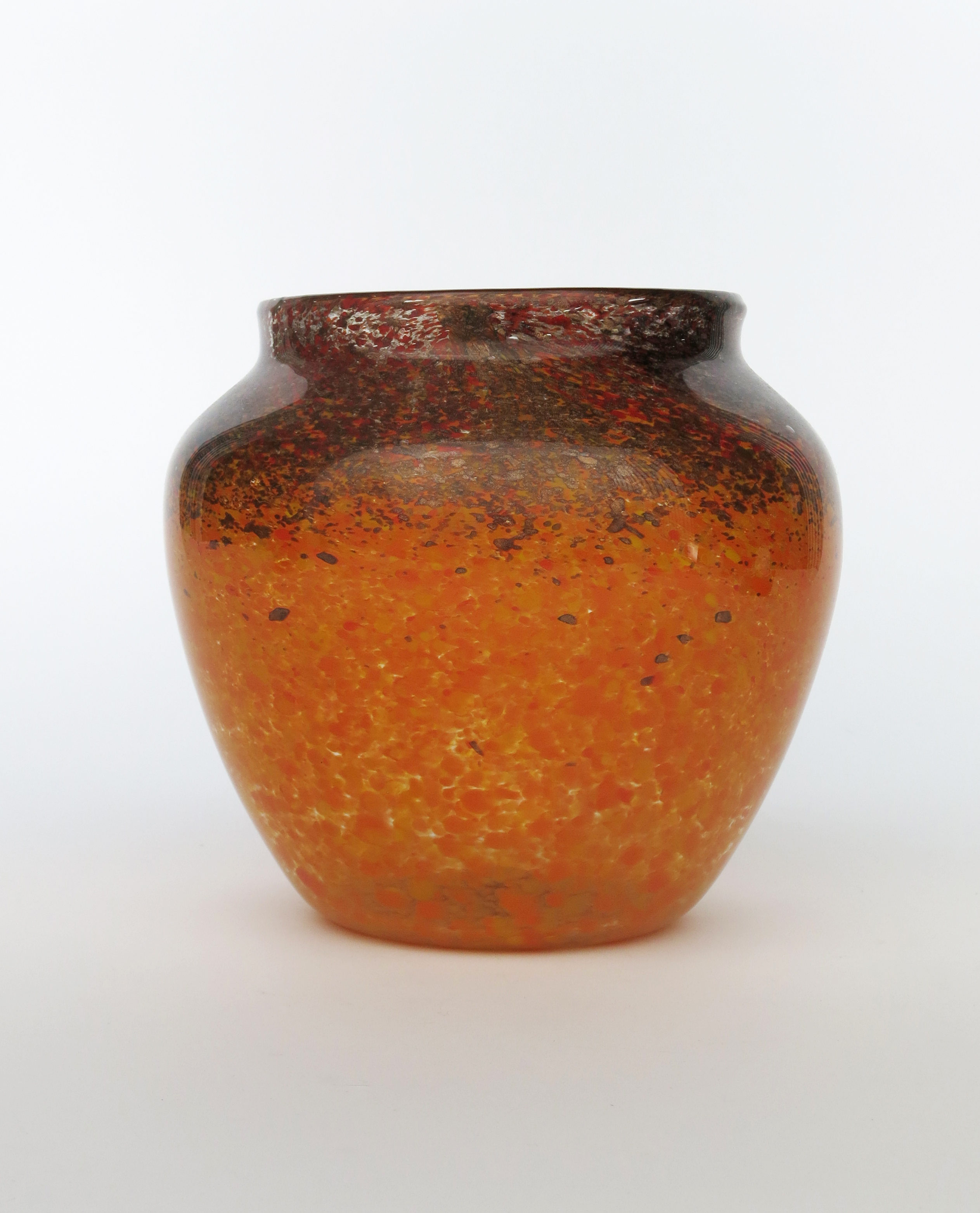 A Moncrieff's Monart Ware glass vase, shape VA, shouldered form, clear glass with red and orange mottled inclusions, with aventurine inclusions, original paper label, 23cm. high
