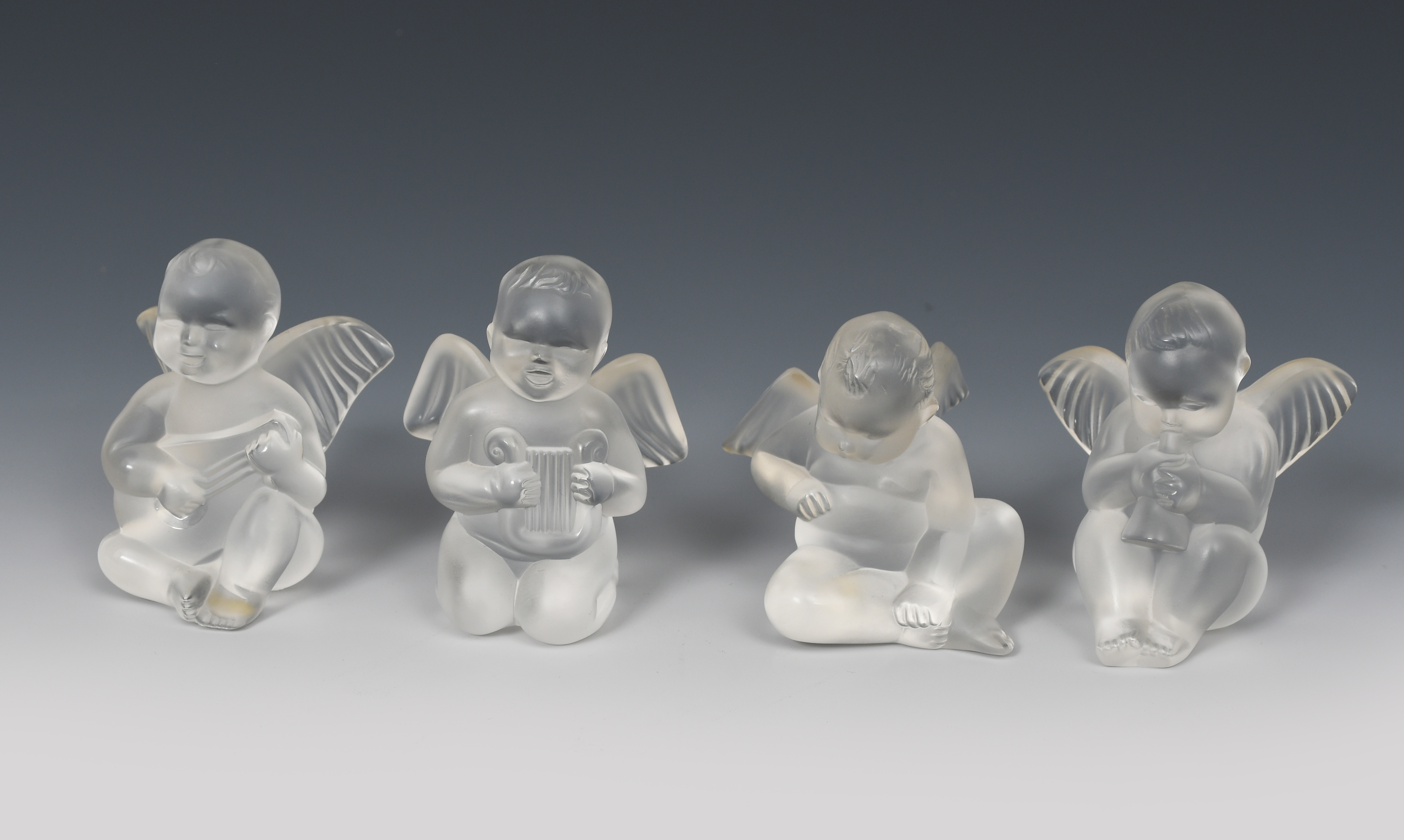 A set of four modern Lalique glass cherubs, three playing instruments, etched Lalique France 8.5cm. high, (4)