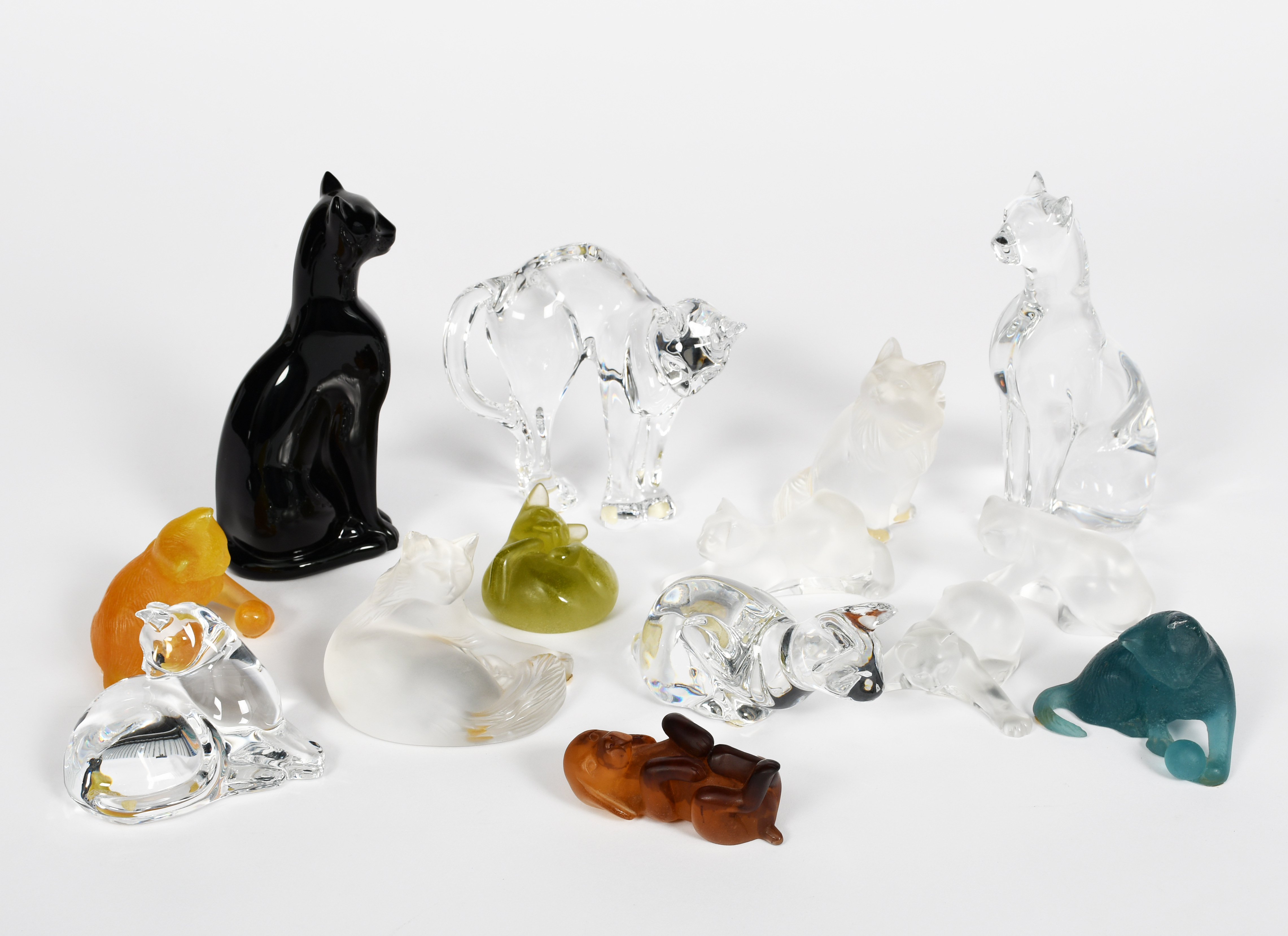 Thirteen glass cats, including Lalique Baccarat and Daum, and a Daum glass puppy various marks, 16cm. high (tallest), (14)
