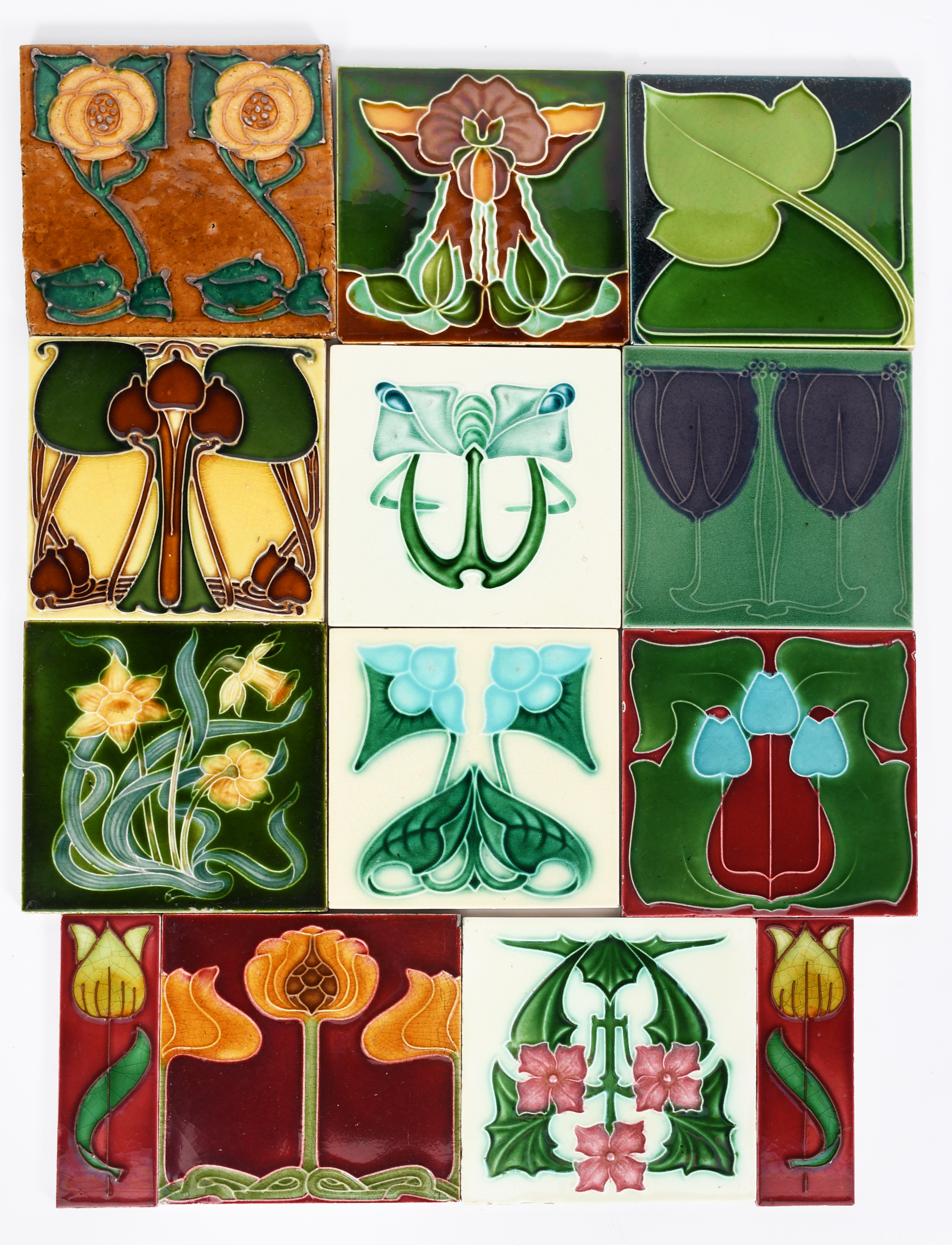 Eleven various Art Nouveau tiles, each tubelined in colours with stylised flowers and foliage, two similar spacer tiles probably Minton's and a small encaustic tile, impressed marks, 15.5cm. square, (14)
