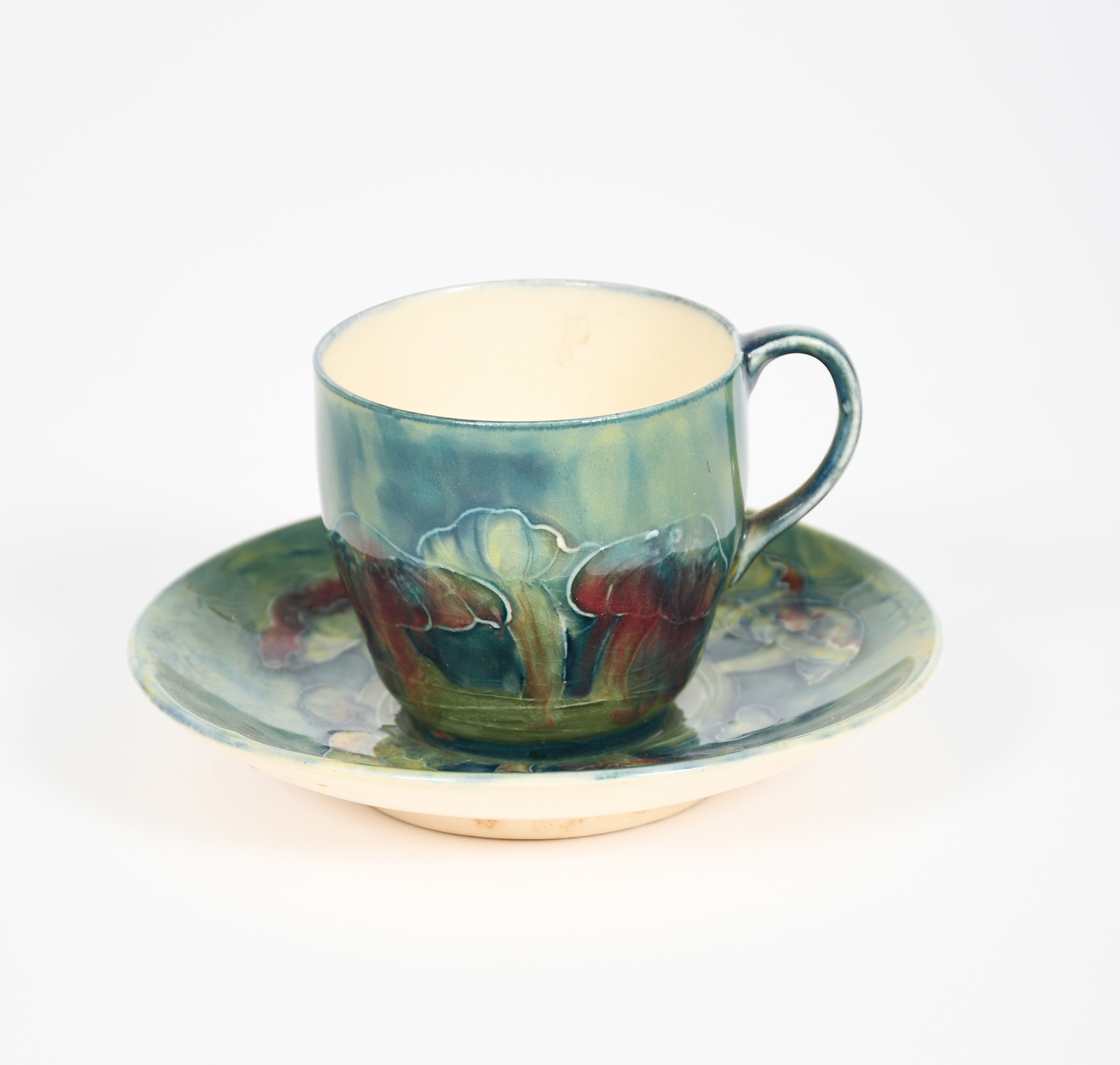 'Claremont' a Moorcroft Pottery coffee cup and saucer designed by William Moorcroft