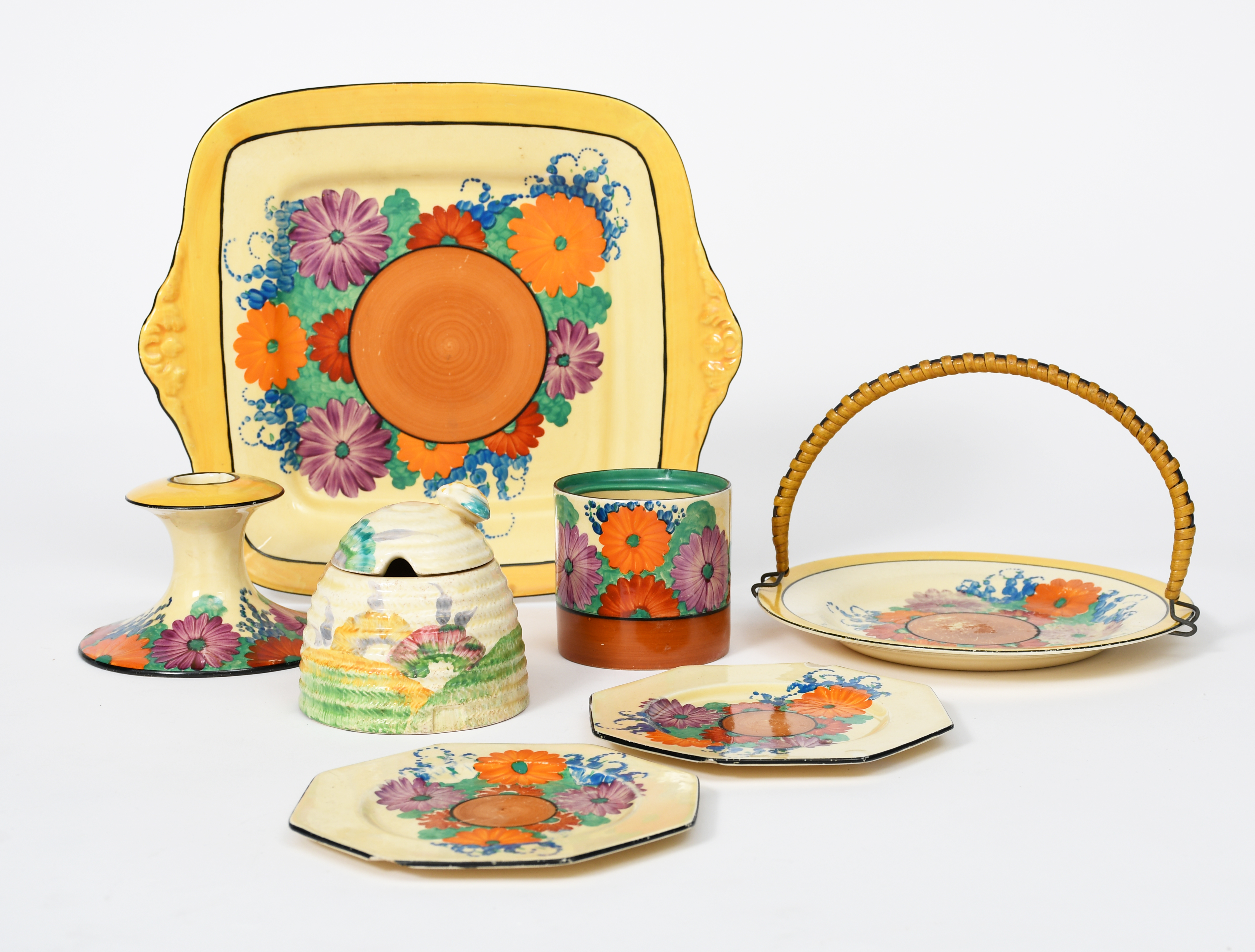 'Aurea' a Clarice Cliff Bizarre Beehive Honey pot and cover, painted in colours, a Gay Day candlestick, two side plates, a Cylindrical preserve pot and two other plates, printed and painted marks, wear and chips to Gay Day plates, 9.5cm. high (8)