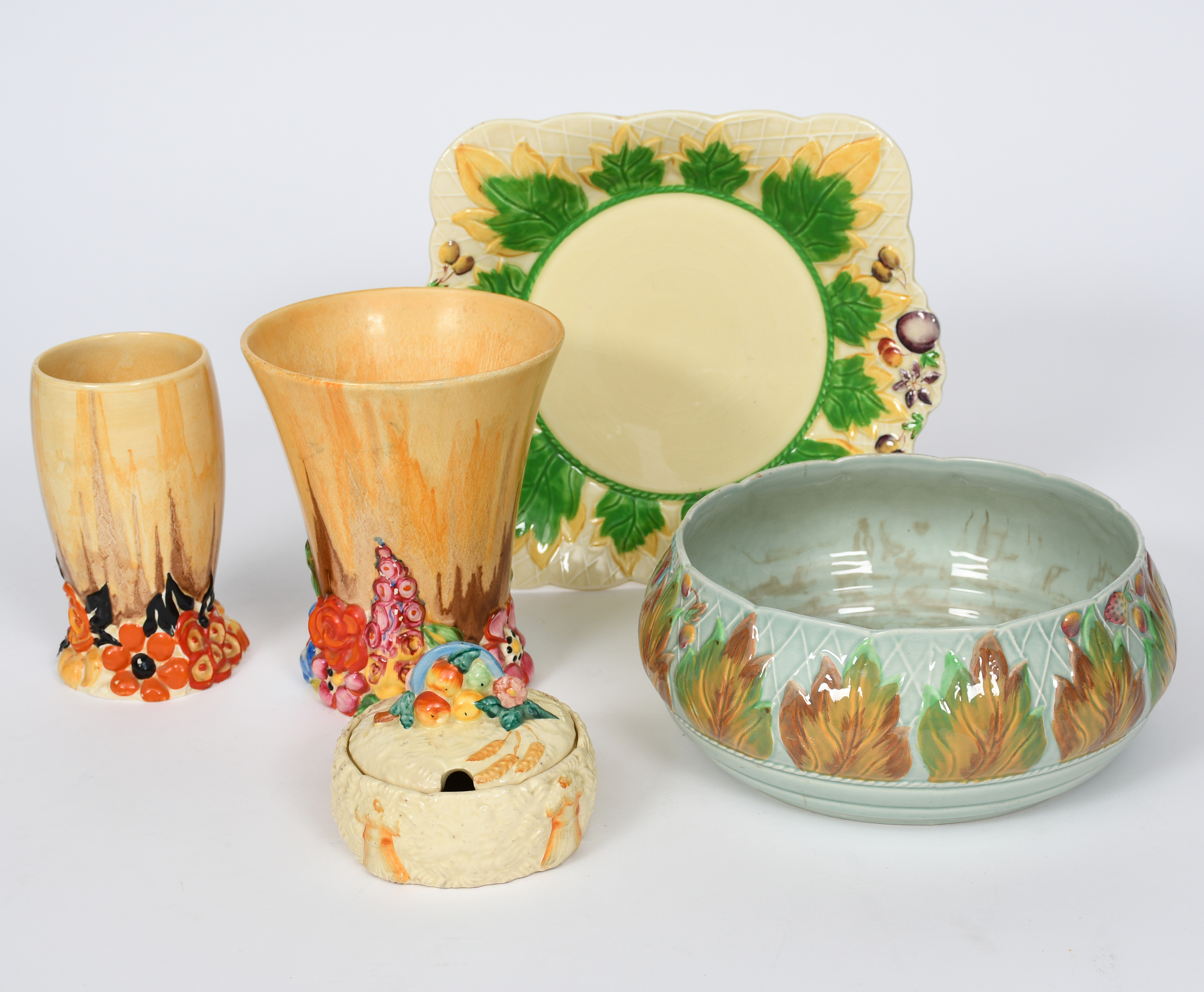 'Celtic Harvest' a Clarice Cliff jug, moulded in relief and painted in colours, another smaller, a preserve pot and cover, two My Garden vases and three other Clarice Cliff moulded ware items printed and painted marks, 28cm. high (9)
