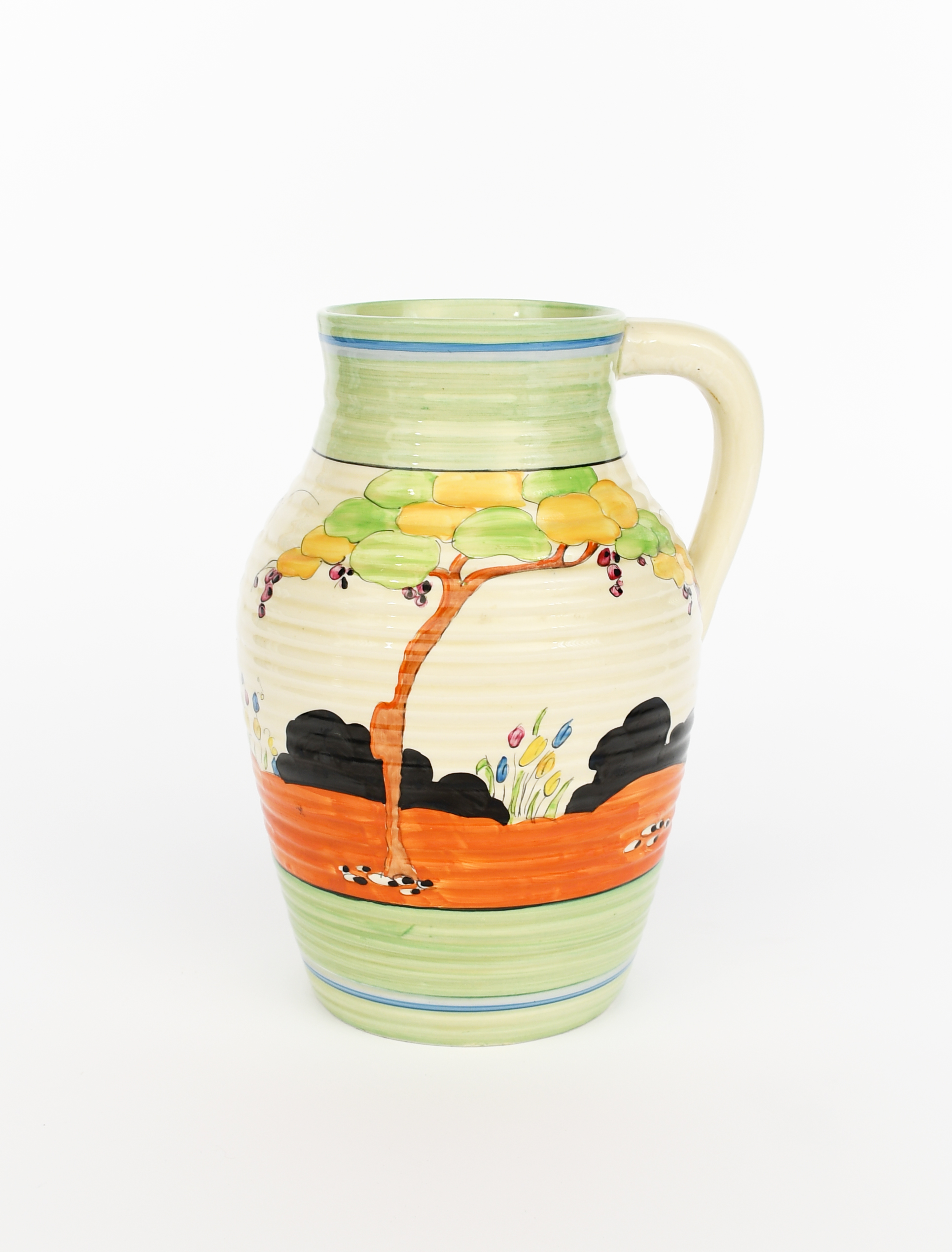 'Tulips' a Clarice Cliff Bizarre single-handled Lotus jug, painted in colours between green bands, 28.5cm. high