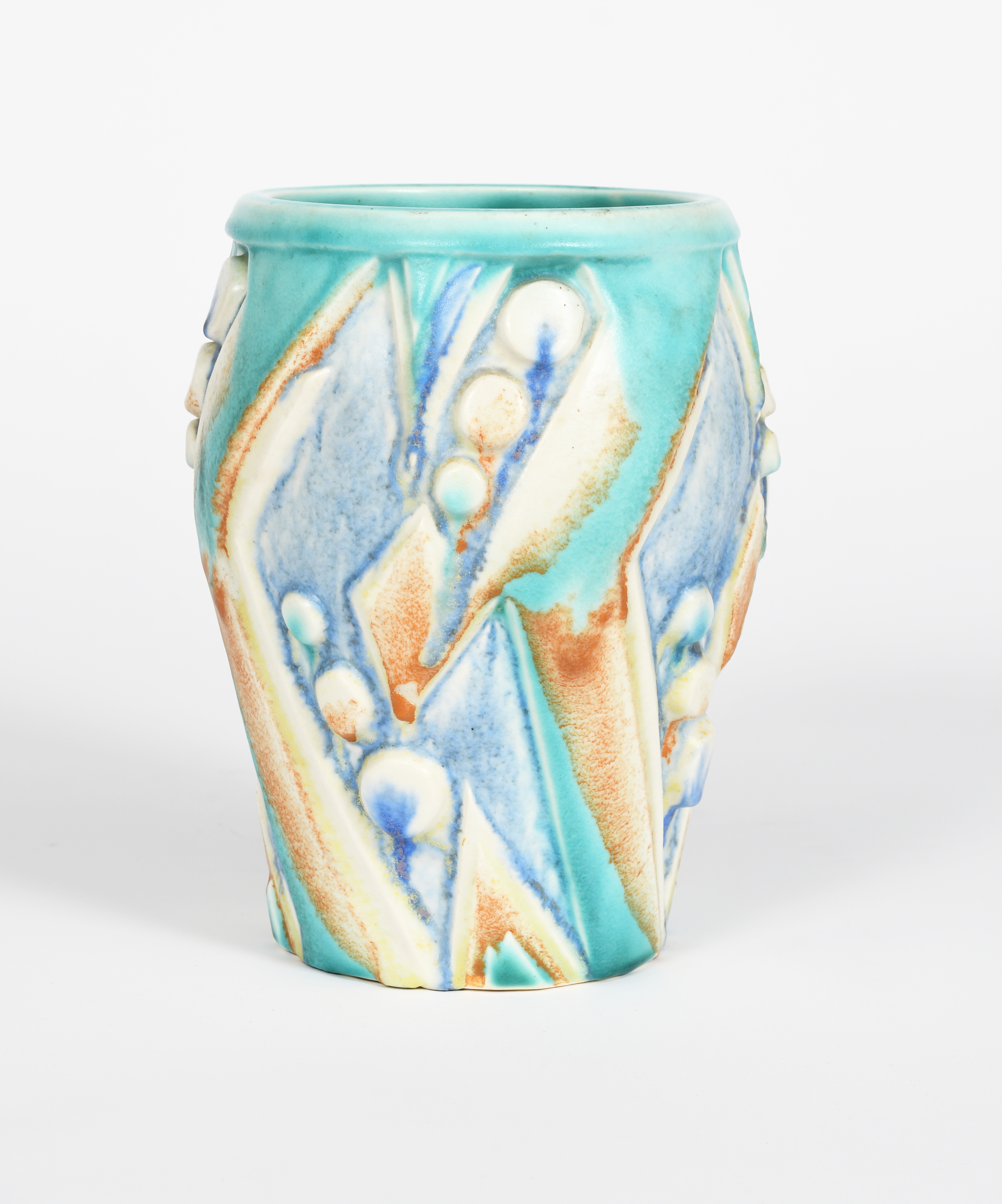 'Inspiration Scraffito' a Clarice Cliff vase, moulded in relief and painted in shades of blue, mushroom and turquoise, remains of printed label to base, 23cm. high