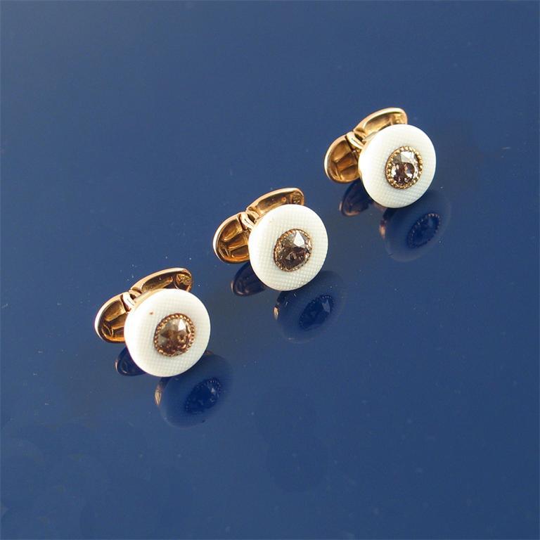 Three dress studs, each centred with a circular cut cinnamon diamond in yellow gold.