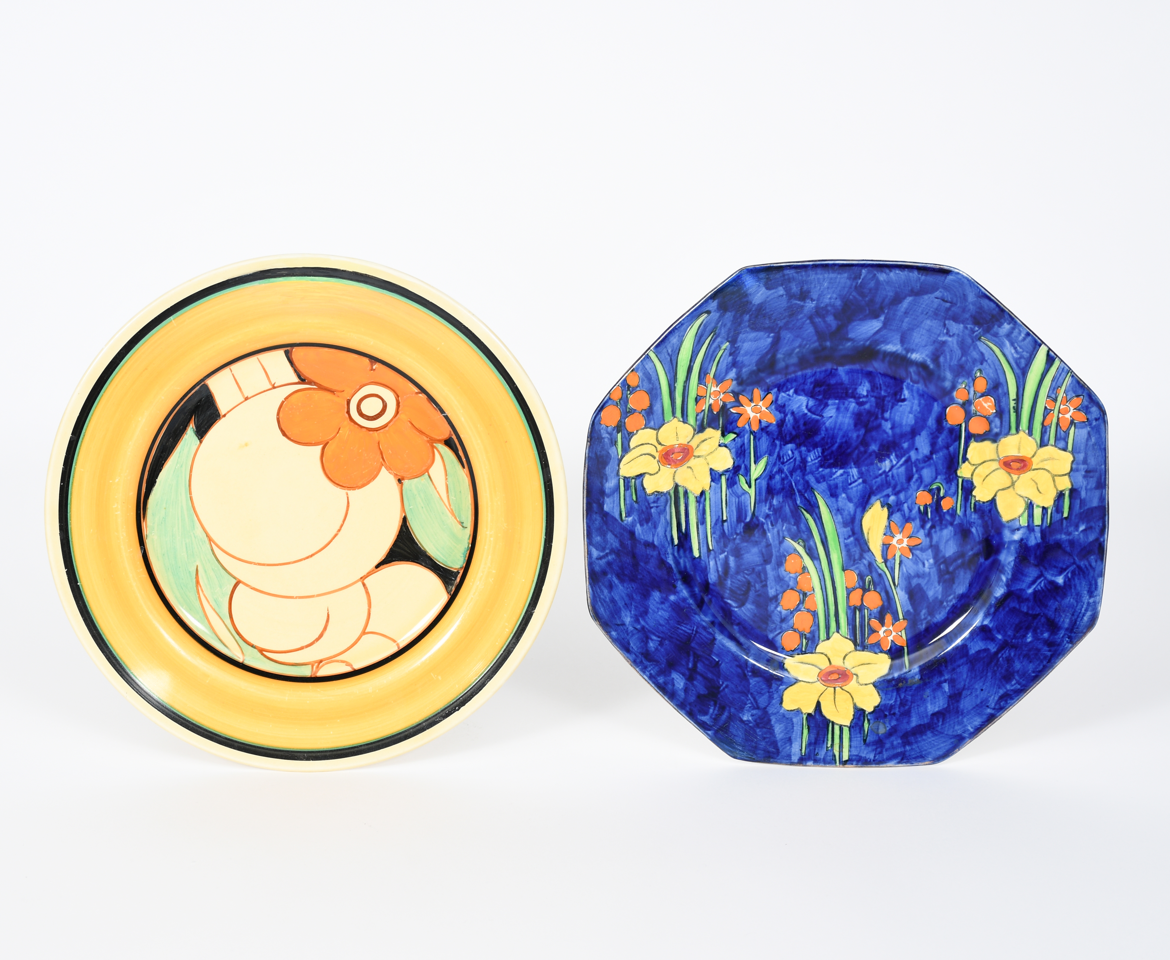 'Floreat' a Clarice Cliff Fantasque Bizarre plate, painted in colours inside yellow band, and a Wilkinson's plate printed and painted with flowers printed marks, 22cm. diam. (2)