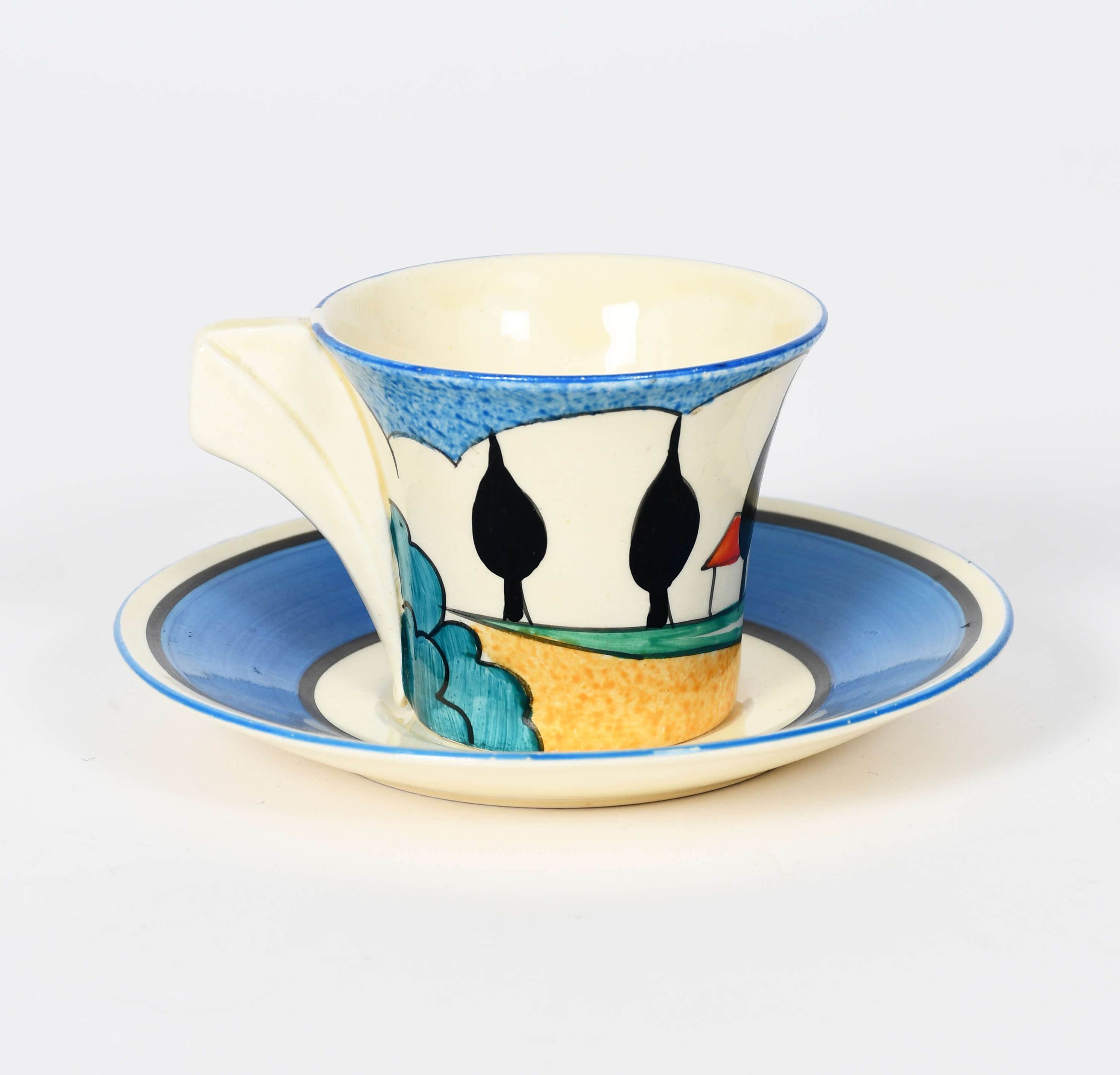 'May Avenue' a Clarice Cliff Bizarre Daffodil cup and saucer, painted in colours, the saucer with blue and black bands, printed factory marks, 6.5cm. high, (2)
