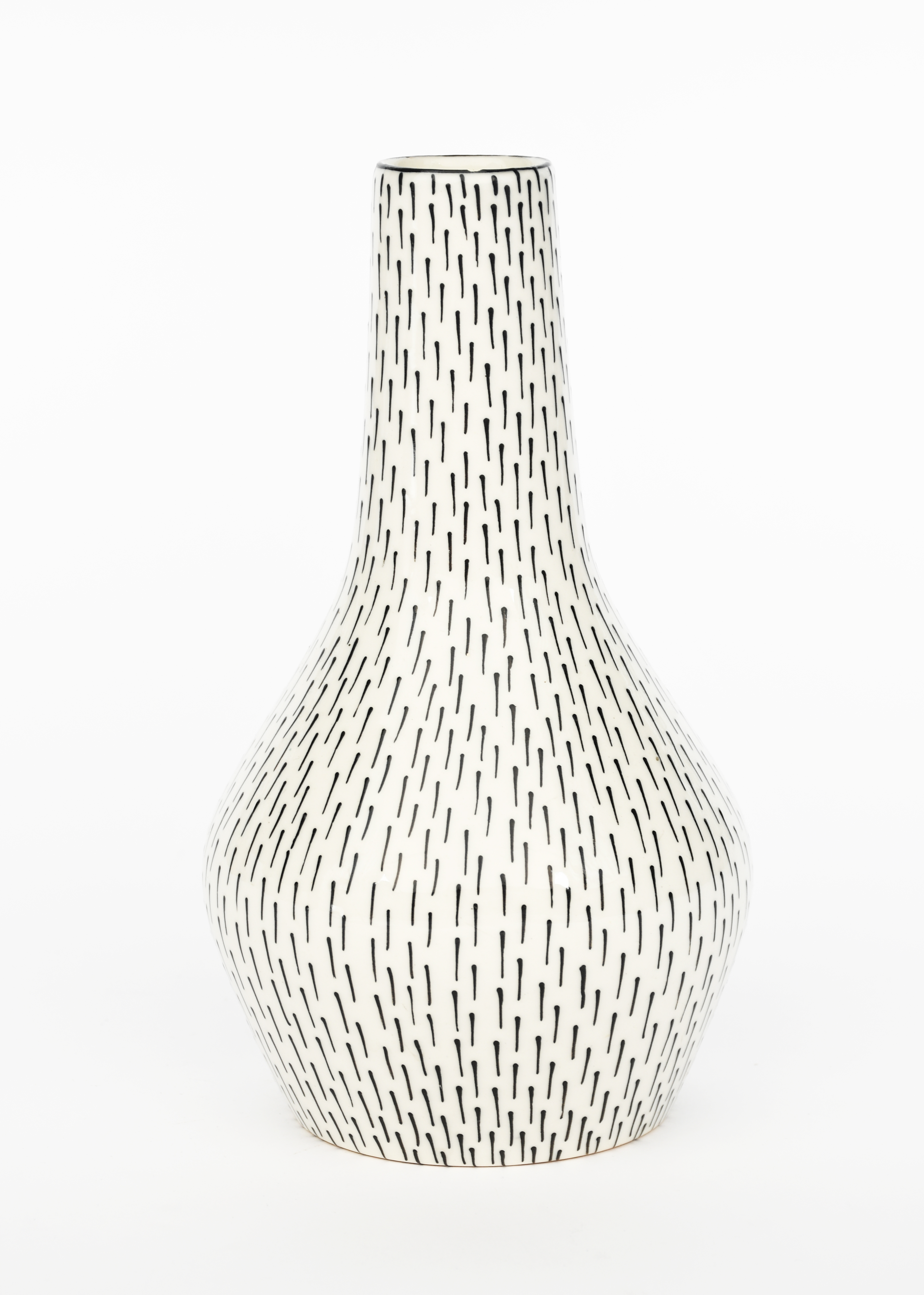 A Midwinter Pottery vase designed by Jessie Tait, ovoid with tapering cylindrical neck, tubeline decorated with black dashes on a white ground printed factory mark, 22.5cm. high