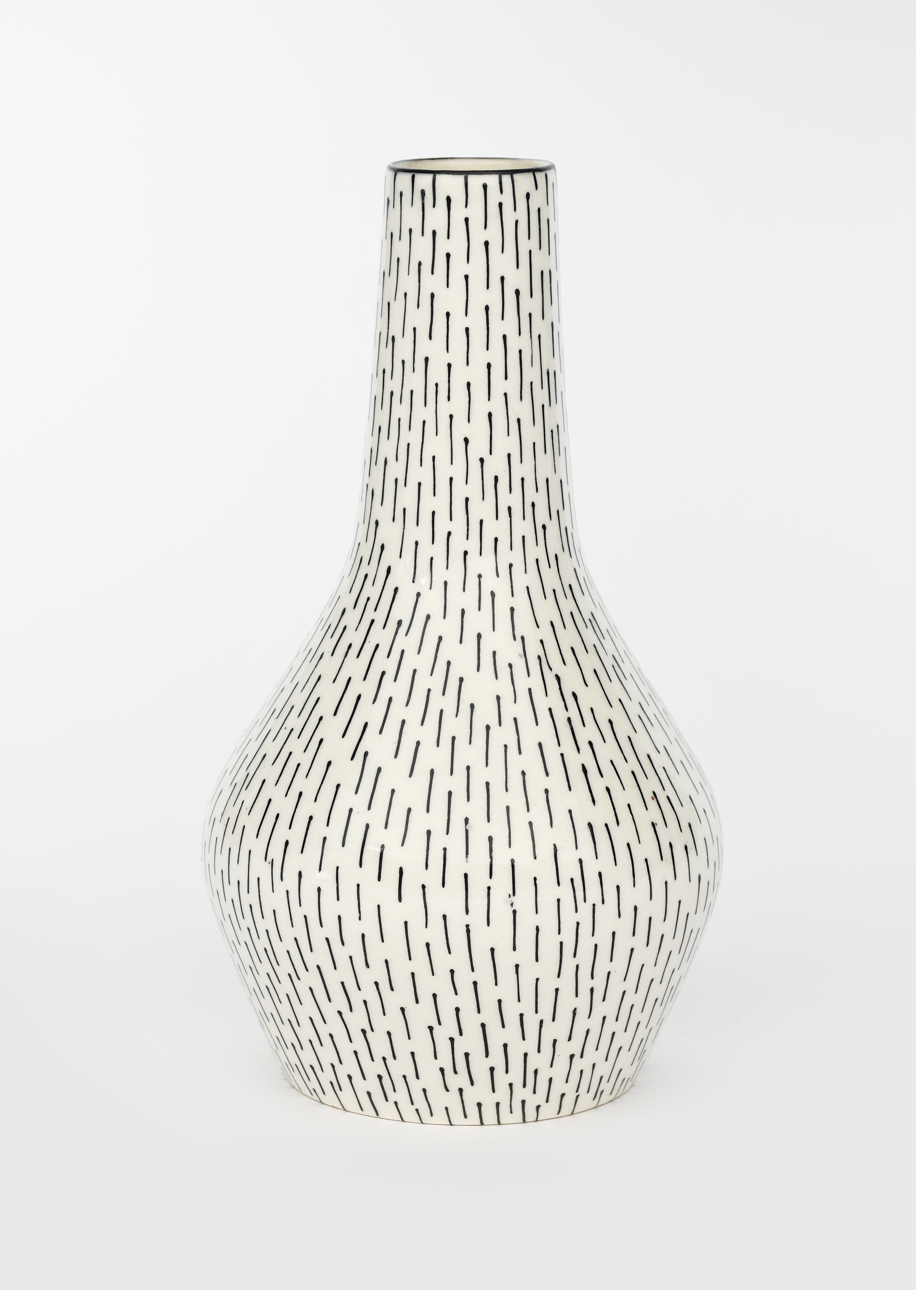 A Midwinter Pottery vase designed by Jessie Tait, shouldered form with tapering neck, tubeline decorated with black dashes on a white ground printed factory marks, 23cm. high
