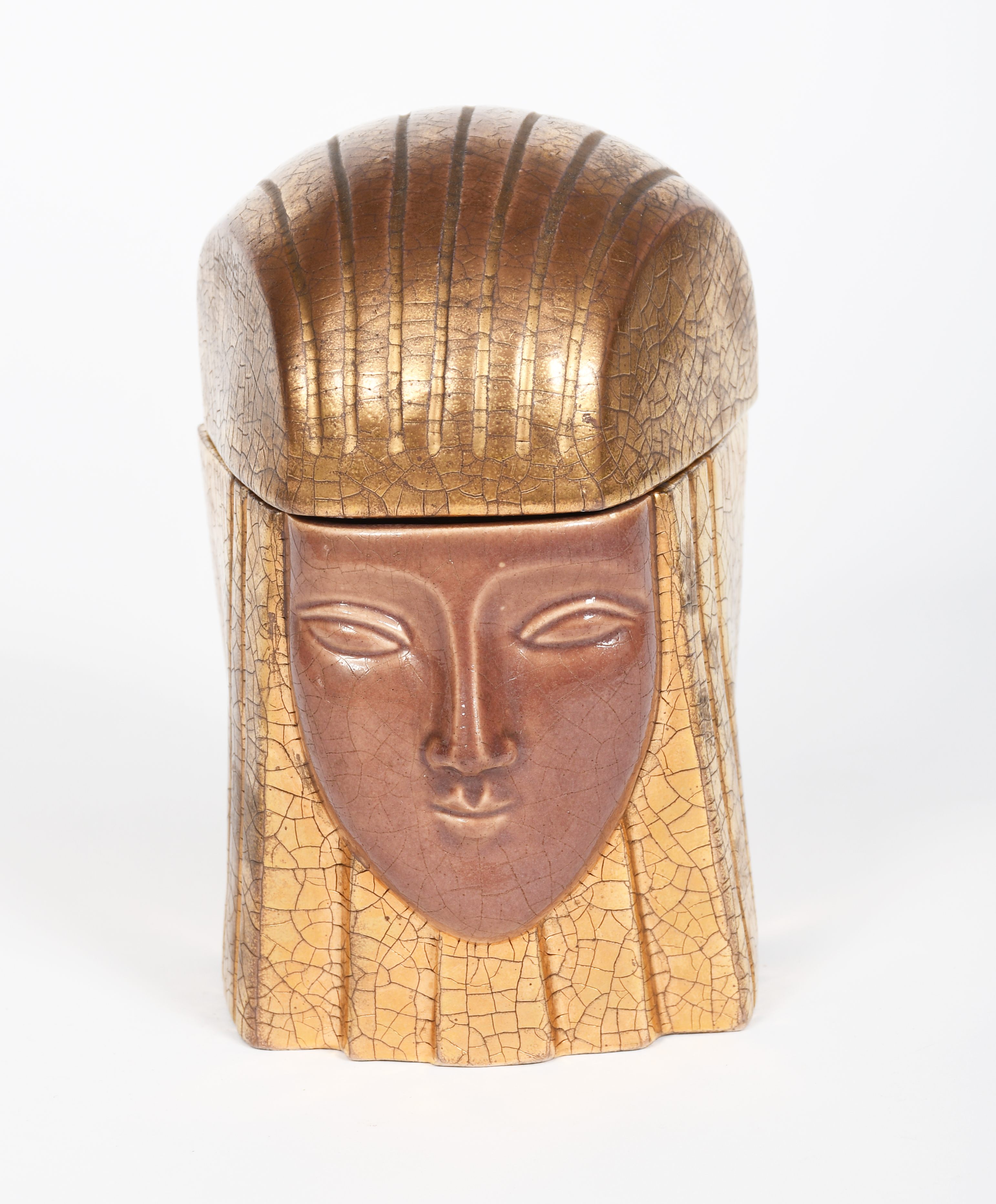 A Robj Pottery Boites a Boubons box and cover, modelled in relief glazed with a crackled gold, a Royal Bonn Art Nouveau vase, a Fischer Budapest enamelled tile and a plate impressed marks, 18.5cm. high (4)