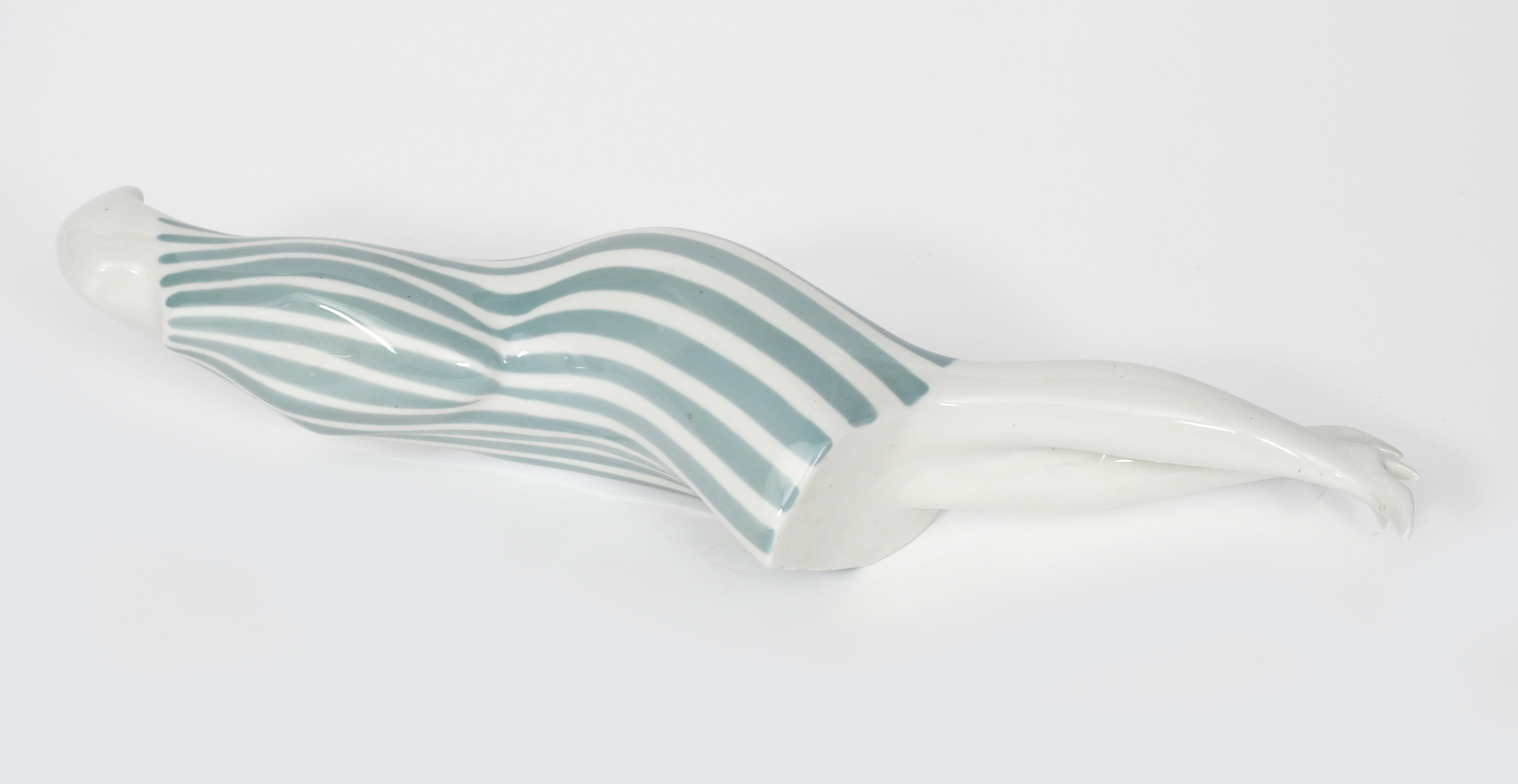 A Royal Dux model of a woman lying down, streamlined and stylised form, in blue striped dress, printed marks, 40cm. wide
