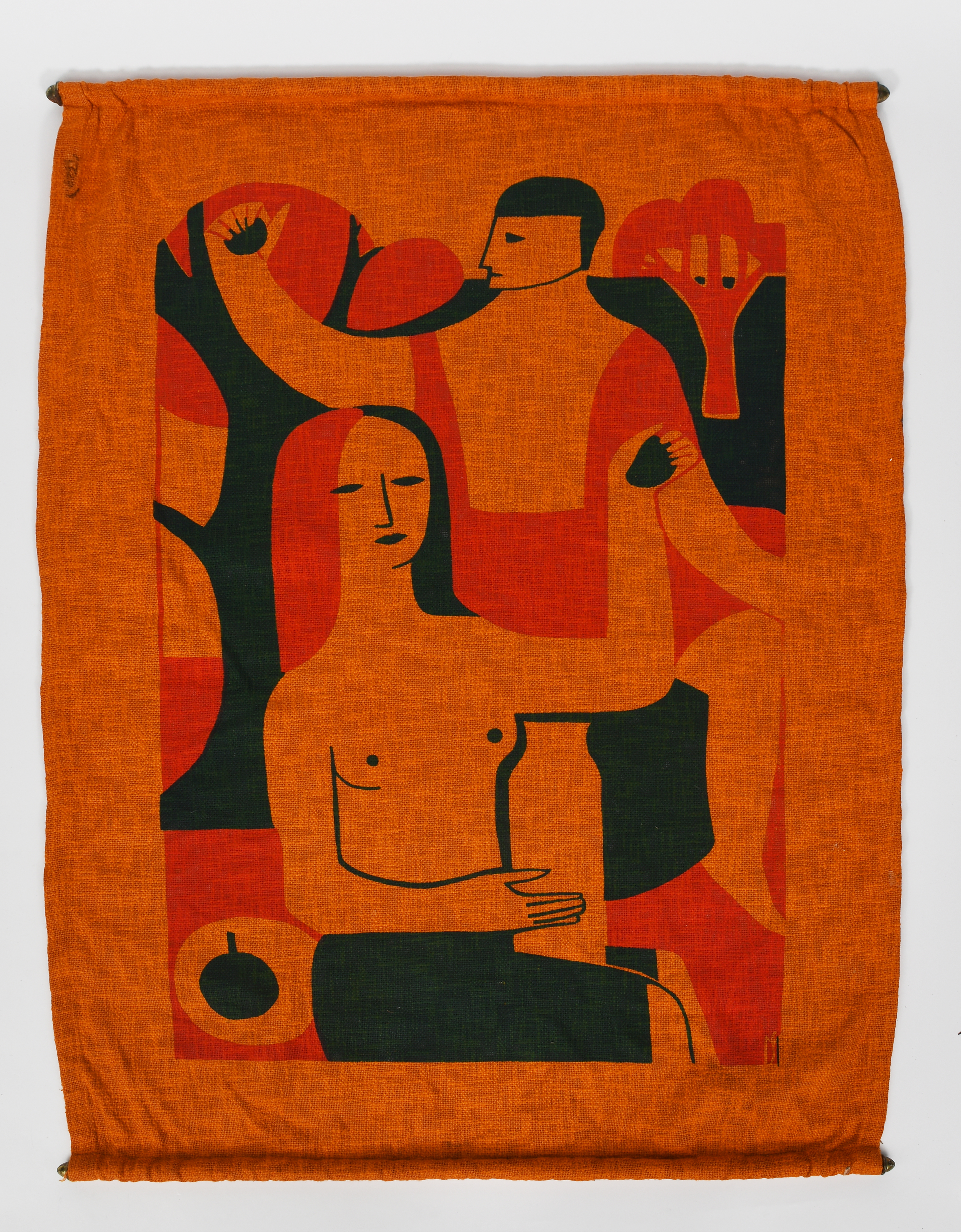 Adam and Eve a screen printed hessian wall hanging, in the manner of Fernand Leger, printed in black and red on an orange ground signed with monogram in the print, 100 x 71cm.