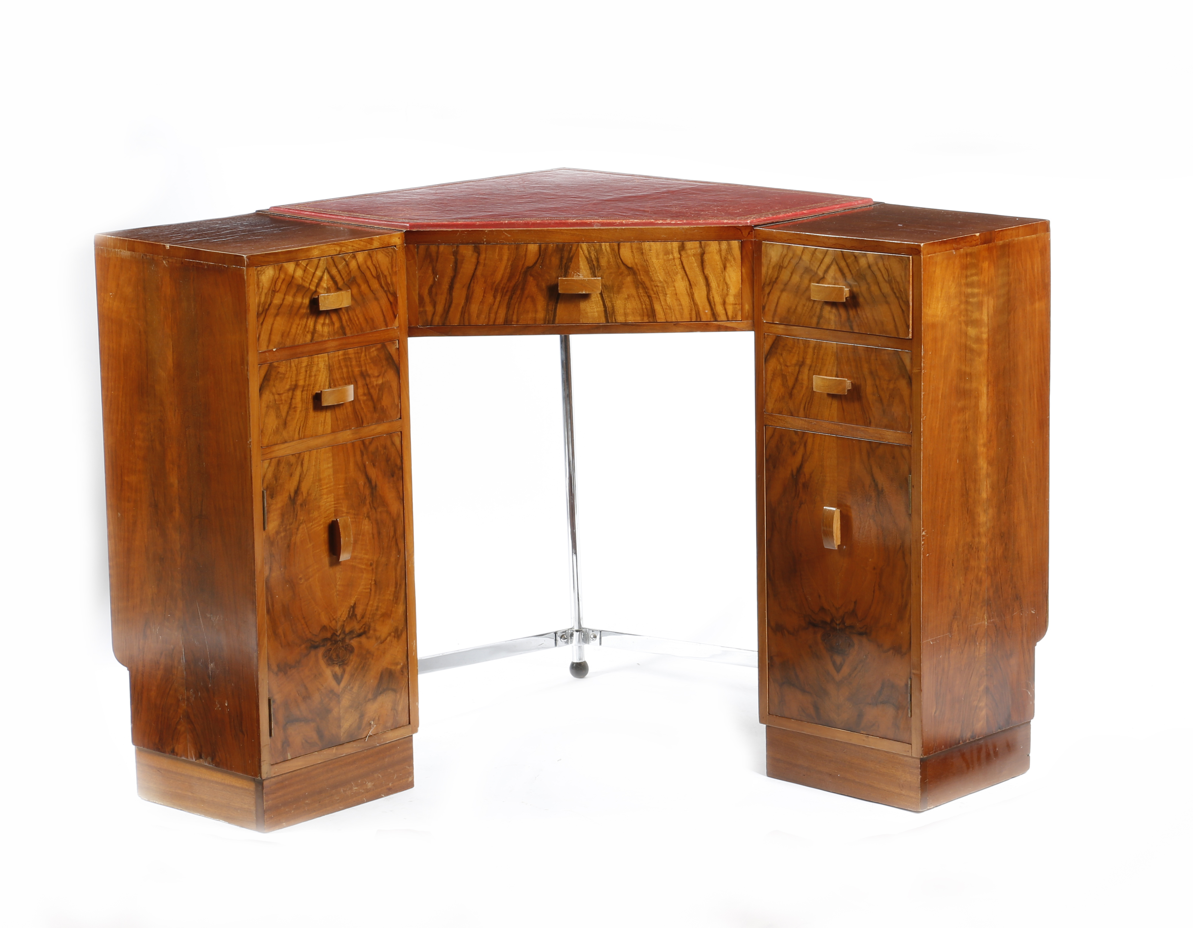 An English Art Deco walnut veneer corner desk, triangular section top with red leather writing desk, with two banks of two drawers over cupboards, unsigned, 126cm. wide 77cm. high