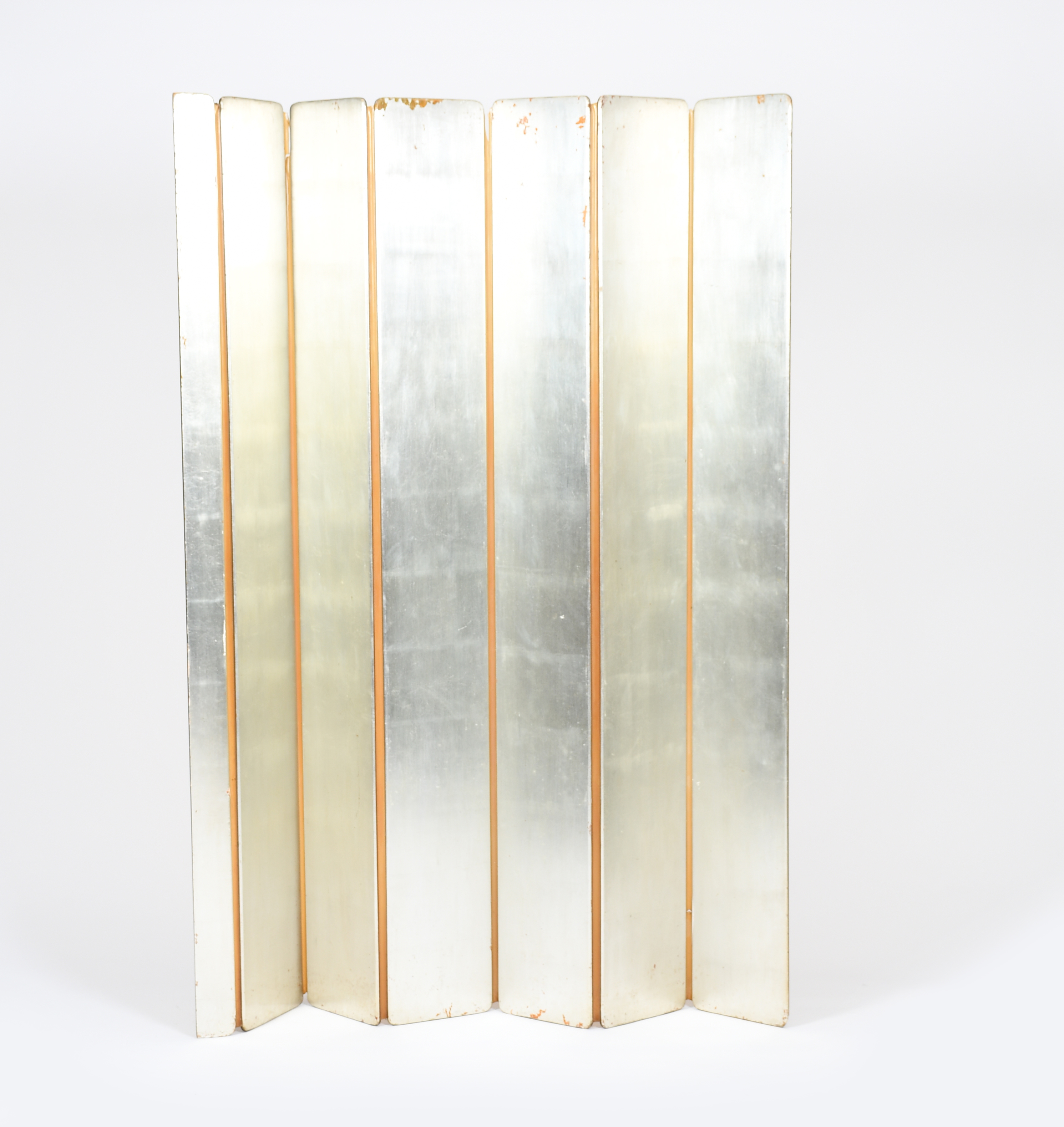 A Rowley Gallery seven-fold screen, the seven fold screen lacquered silver on one side and gold to reverse, with clear plastic tube hinges unsigned, 178cm. high, 23cm wide (each panels)