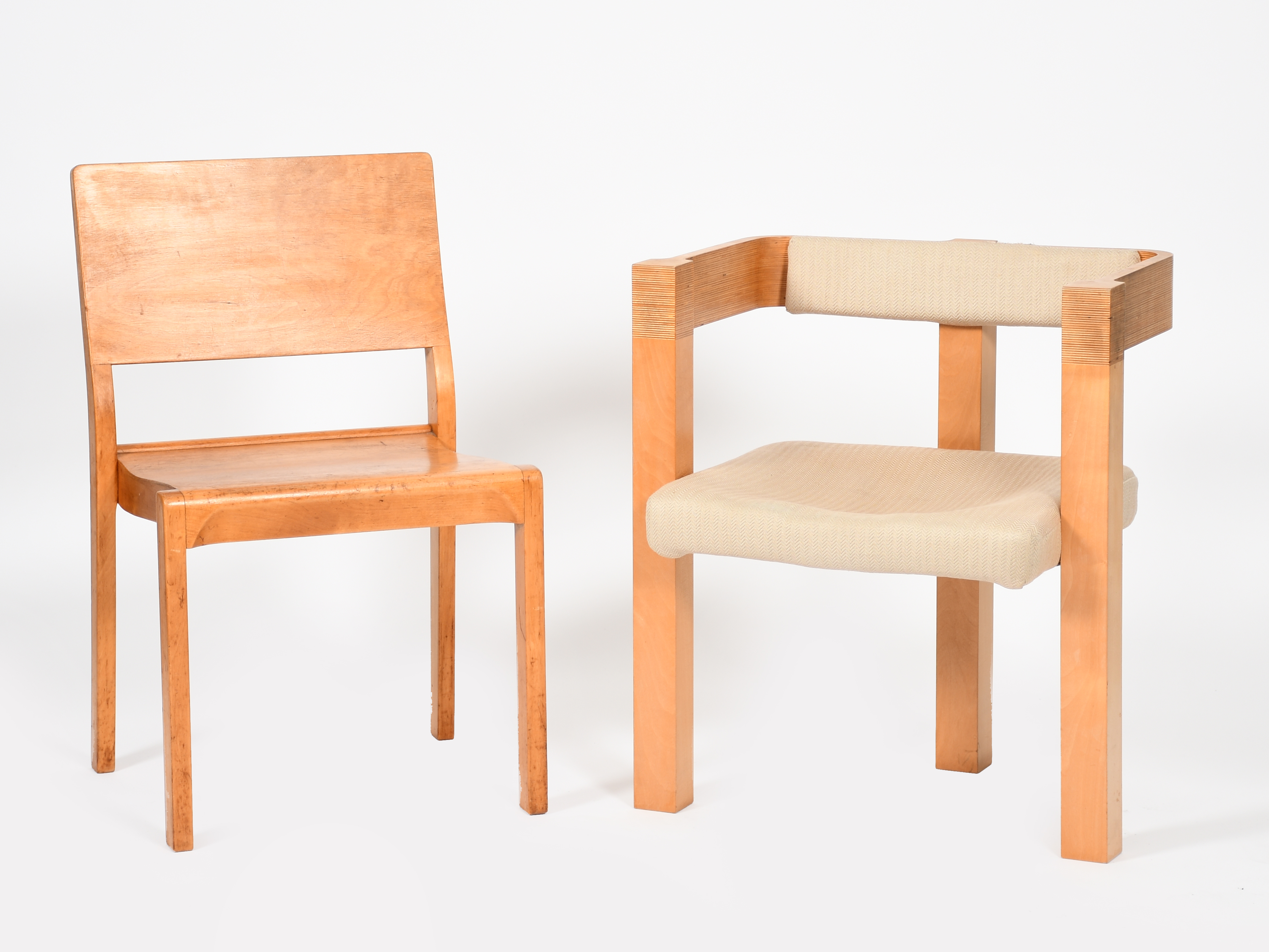‡A John Makepeace maple wood armchair, with laminate arm and back support, with textile back and seat pads, and a plywood chair, armchair stamped John Makepeace, 71cm. high, (2)