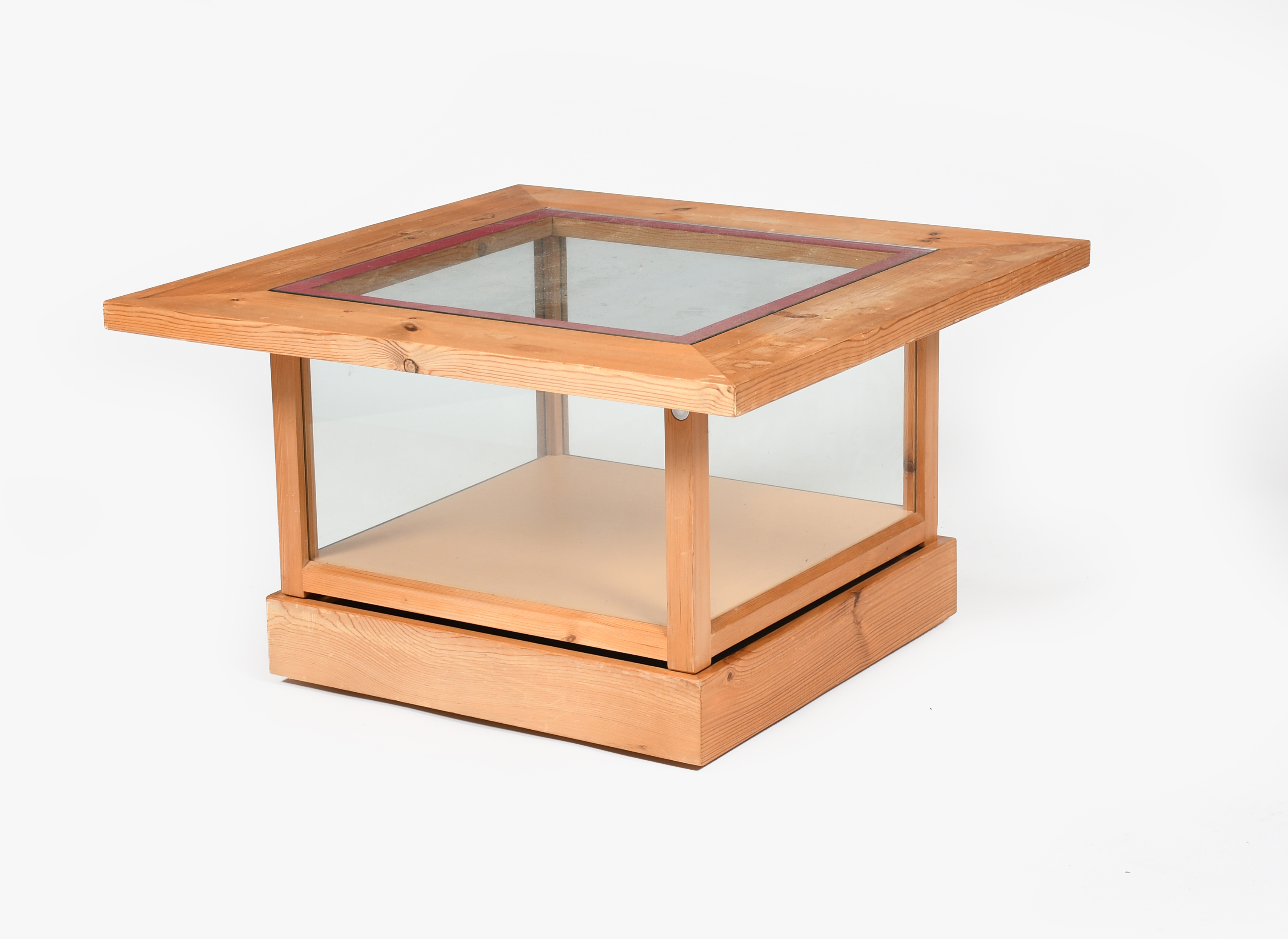 ‡A John Makepeace pine Collector's table, square section with central glazed cabinet, and a John Makepeace marble inset pine occasional table, rectangular section, the marble inlaid with a table lamp on flexible stem, unsigned, 81 x 58cm, and 72cm. square (2)