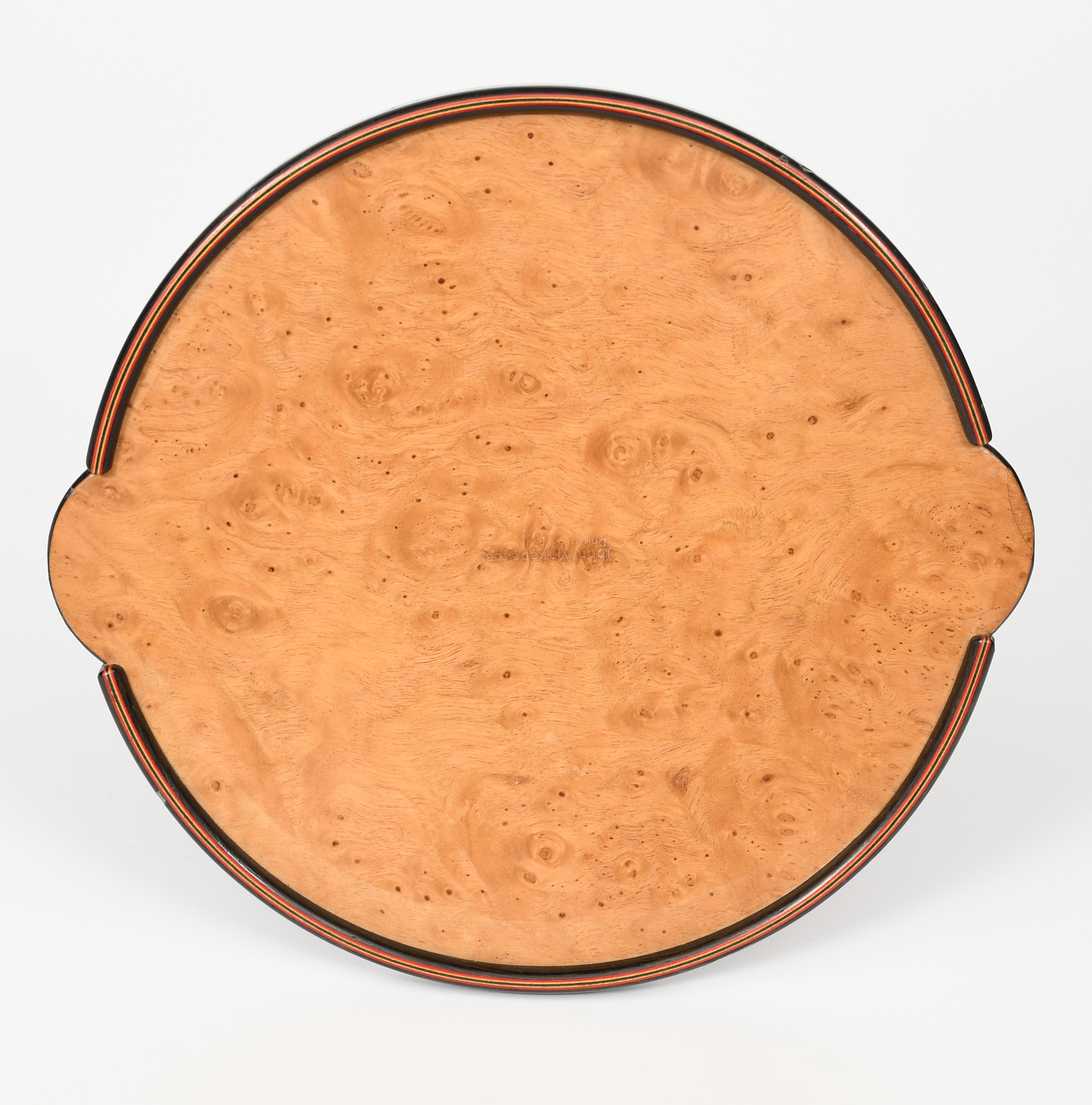 A John Makepeace burr walnut card tray, circular with two disc handles, the rim with ebony and stained wood laminate edge signed John Makepeace, 25.5cm. diam.