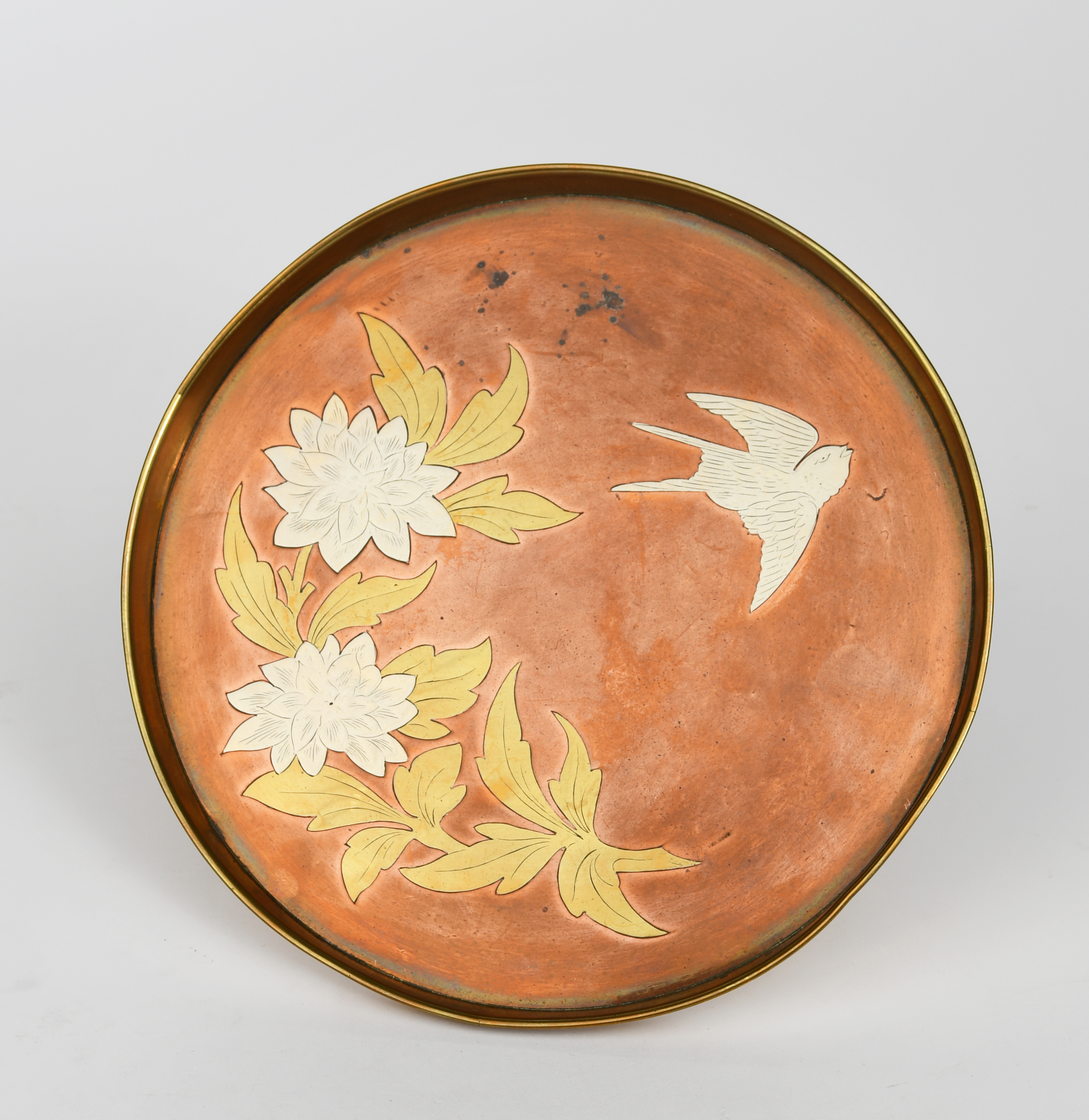 A Benham & Froud Japoniste copper and brass card tray probably designed by Dr Christopher Dresser, circular with raised rim, the copper well decorated with a swallow flying past flowering foliage, highlighted in white metal, stamped Benham & Froud mark, 26.5cm. diam.