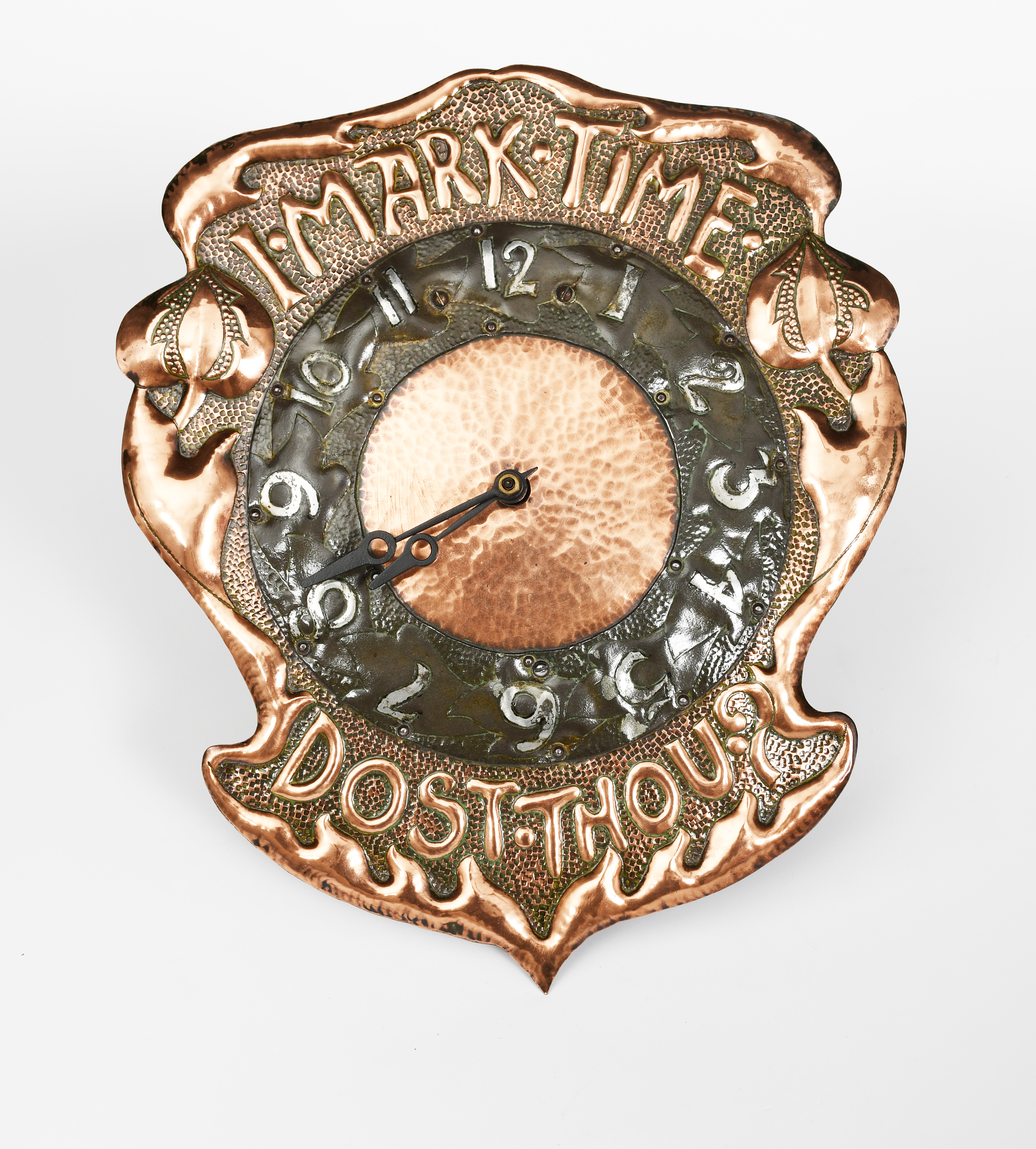 An Arts and Crafts copper wall clock, stamped in low relief with foliate border, inscribed I Mark Time Dost Thou; the circular dial with pewter Arabic figures, the pendulum with circular mask panel, unsigned, 38cm. high