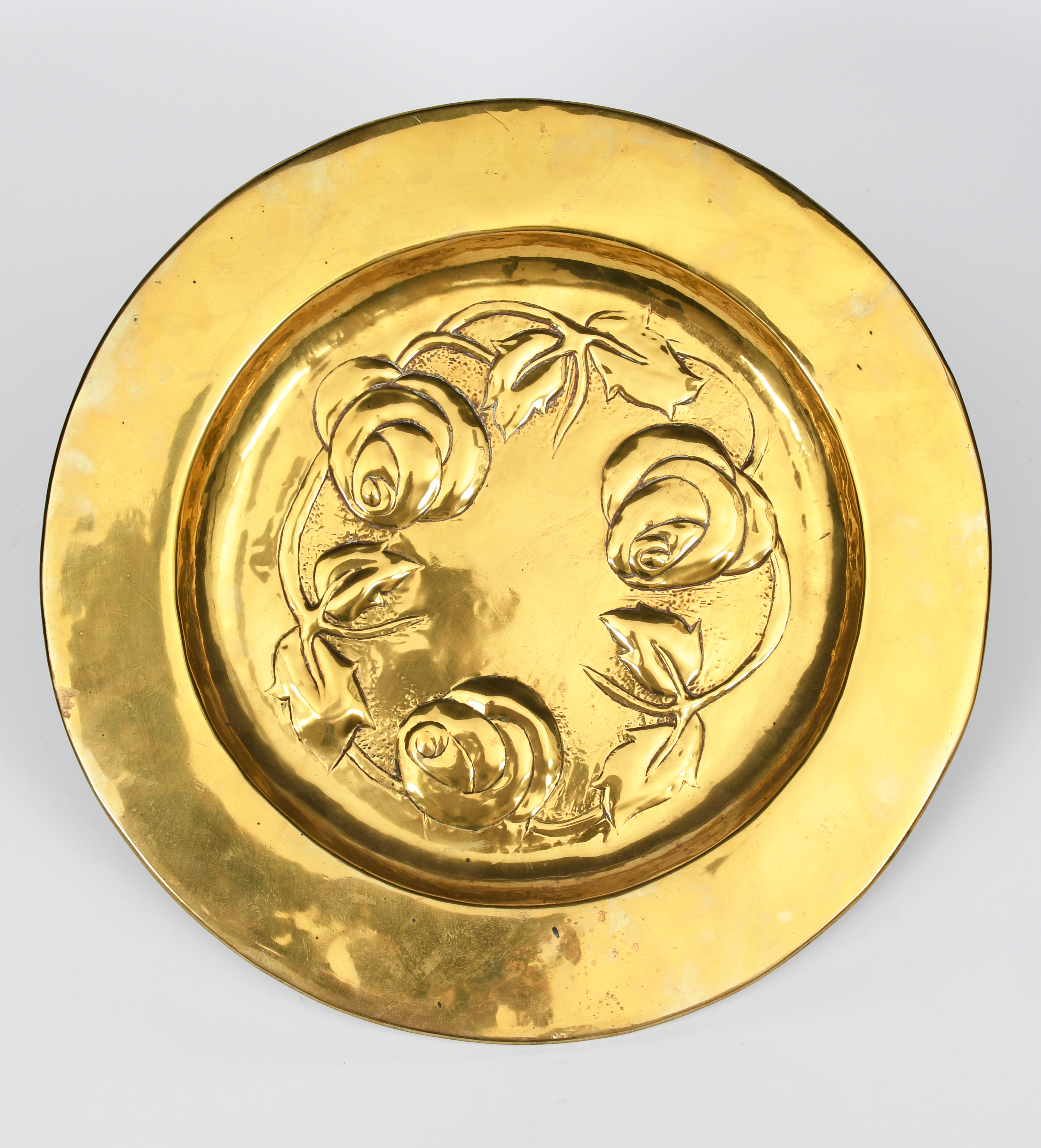 A Glasgow School brass charger, stamped in low relief to the well with three rose flower unsigned, 42cm. diam.