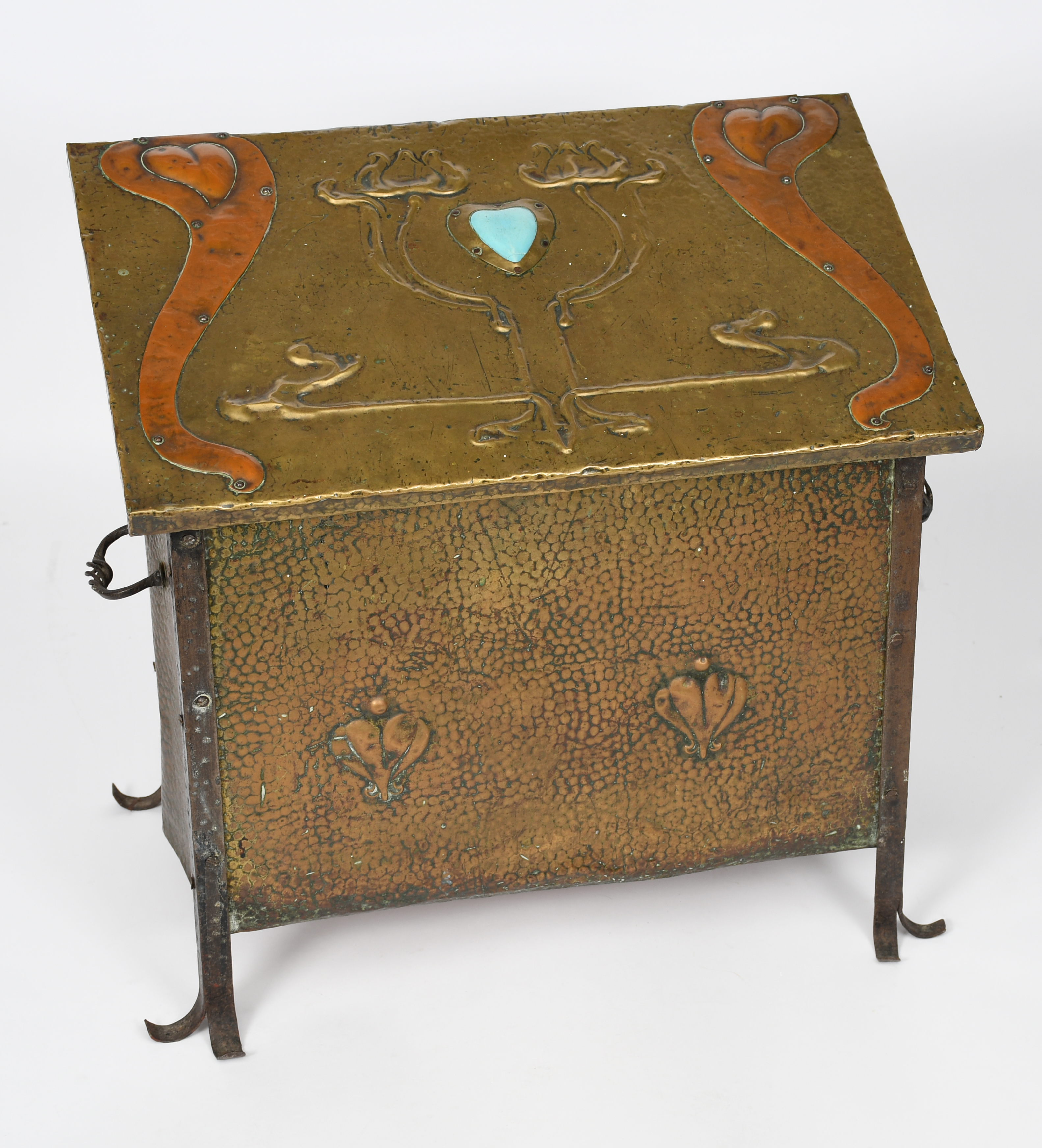 An Arts and Crafts brass box with hinged cover, for coal or boots, brass over wood, with wrought iron handles and feet, the hinged, angled cover with patinated Art Nouveau straps, raised foliate design with central turquoise ceramic heart, hammered finish unsigned, 56cm. wide.