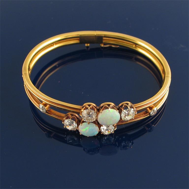 A Victorian diamond and opal gold hinged bangle, the two row gold fluted hinged bangle mounted with six circular cut diamonds and two white opals. Fitted case.
