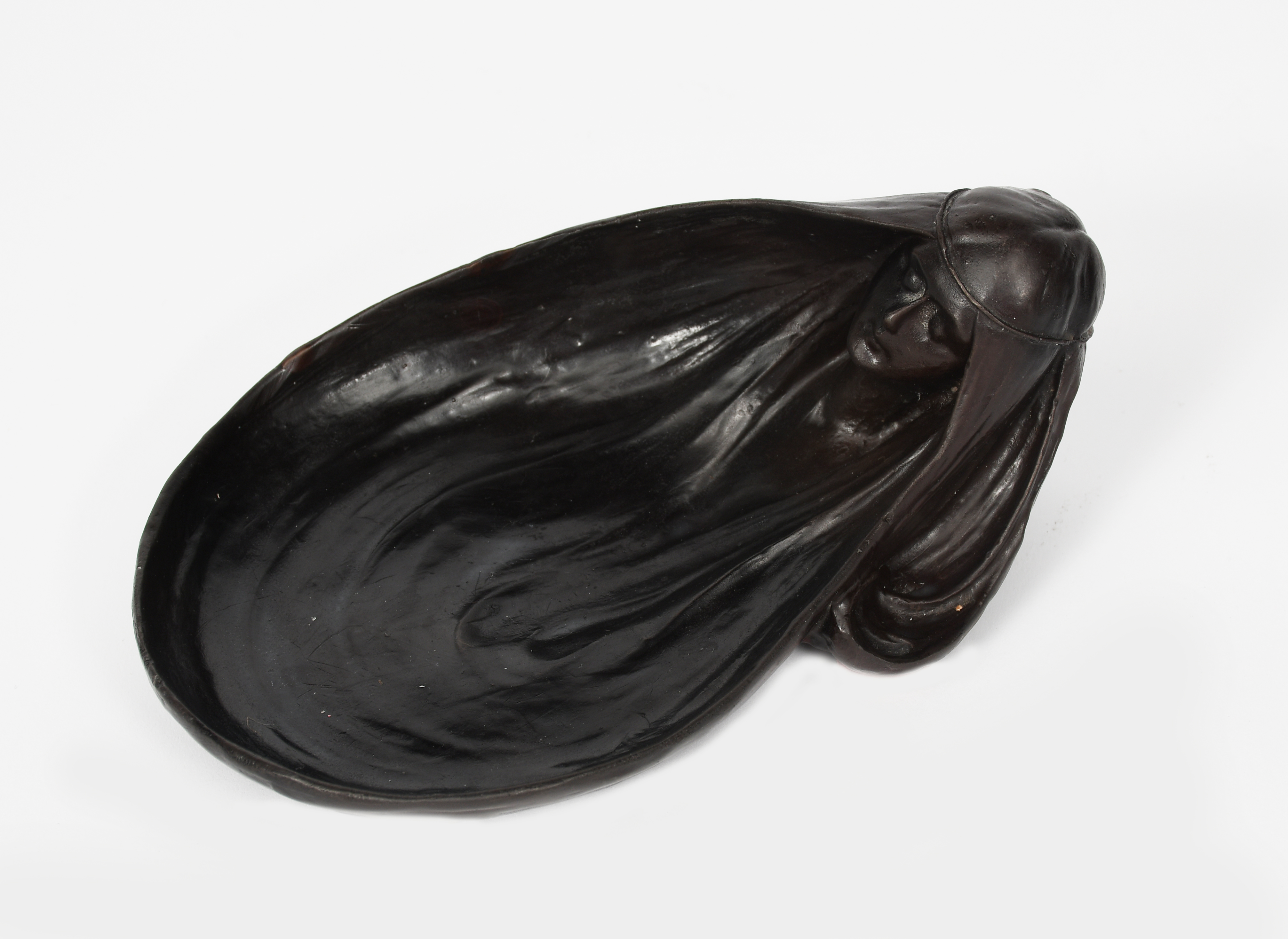 An Art Nouveau style vide poche cast from a model by Gustav Gurschner, cast as a maiden with long flowing hair forming the bowl, deep brown patina, unsigned, 20cm. wide