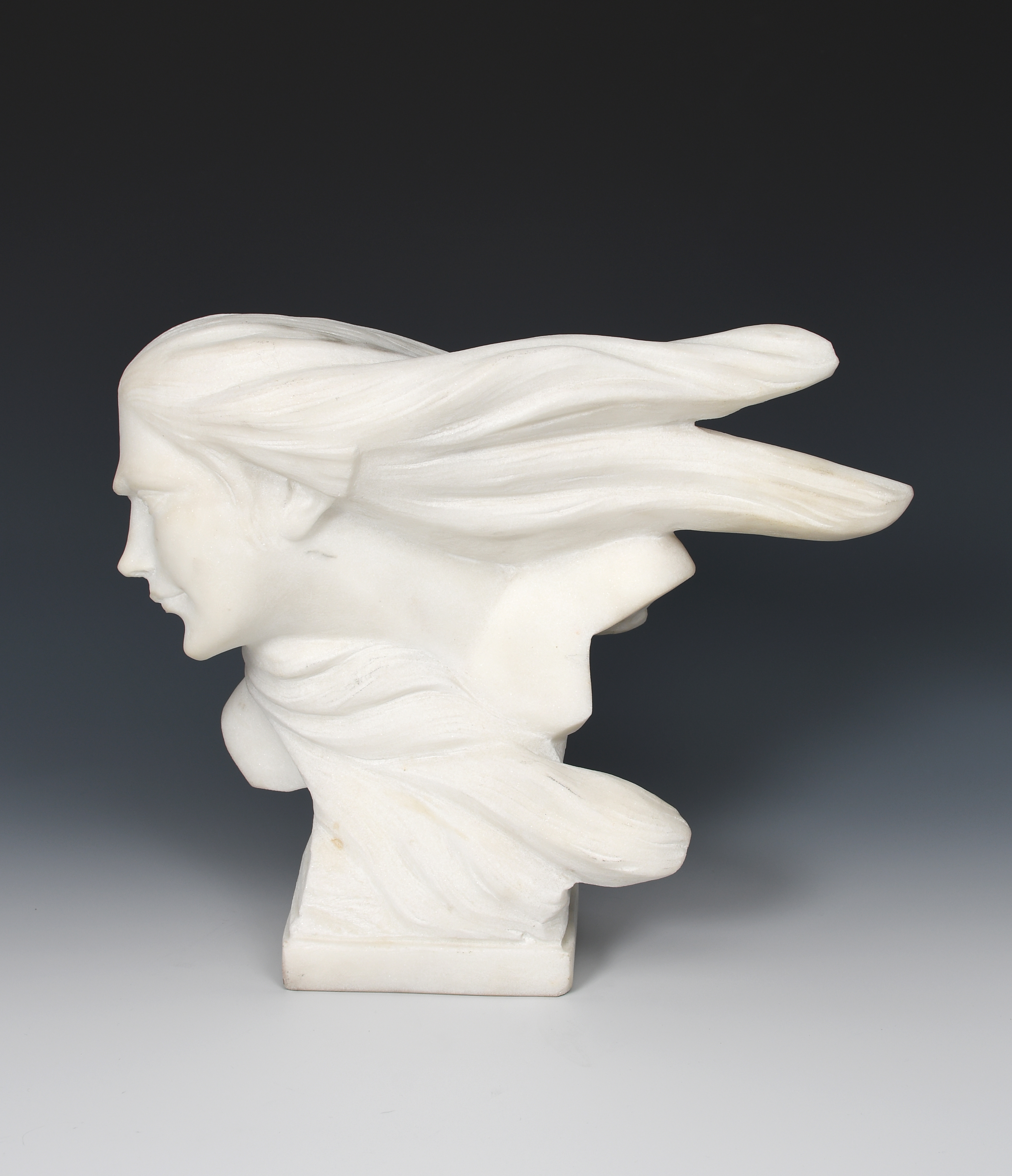 An Art Nouveau white marble bust of a maiden, with long flowing hair, on square plinth, signed Rowenna and indistinct monogram, 27cm. high