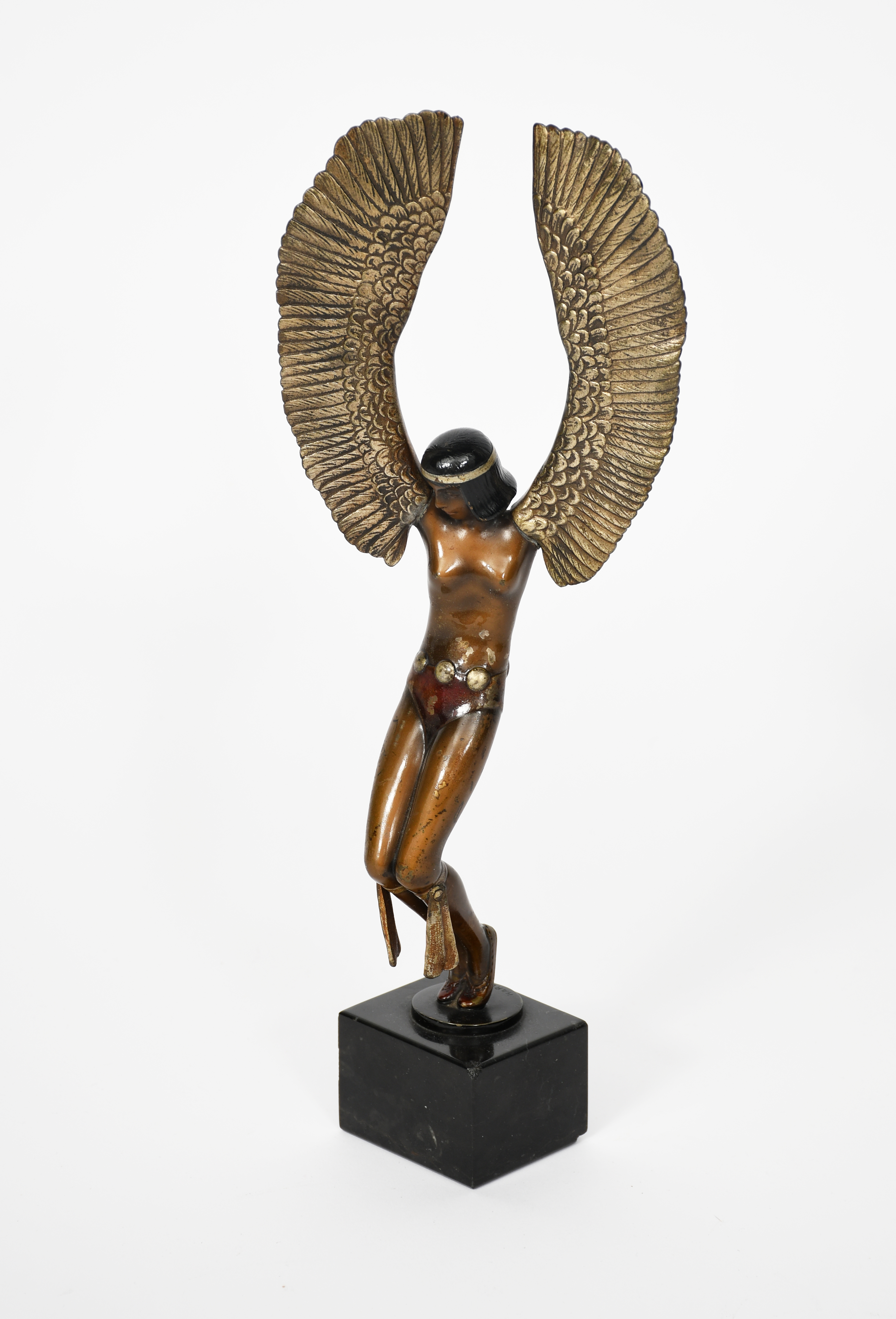 patinated bronze model of a crouching woman with feather wings, on polished black slate base