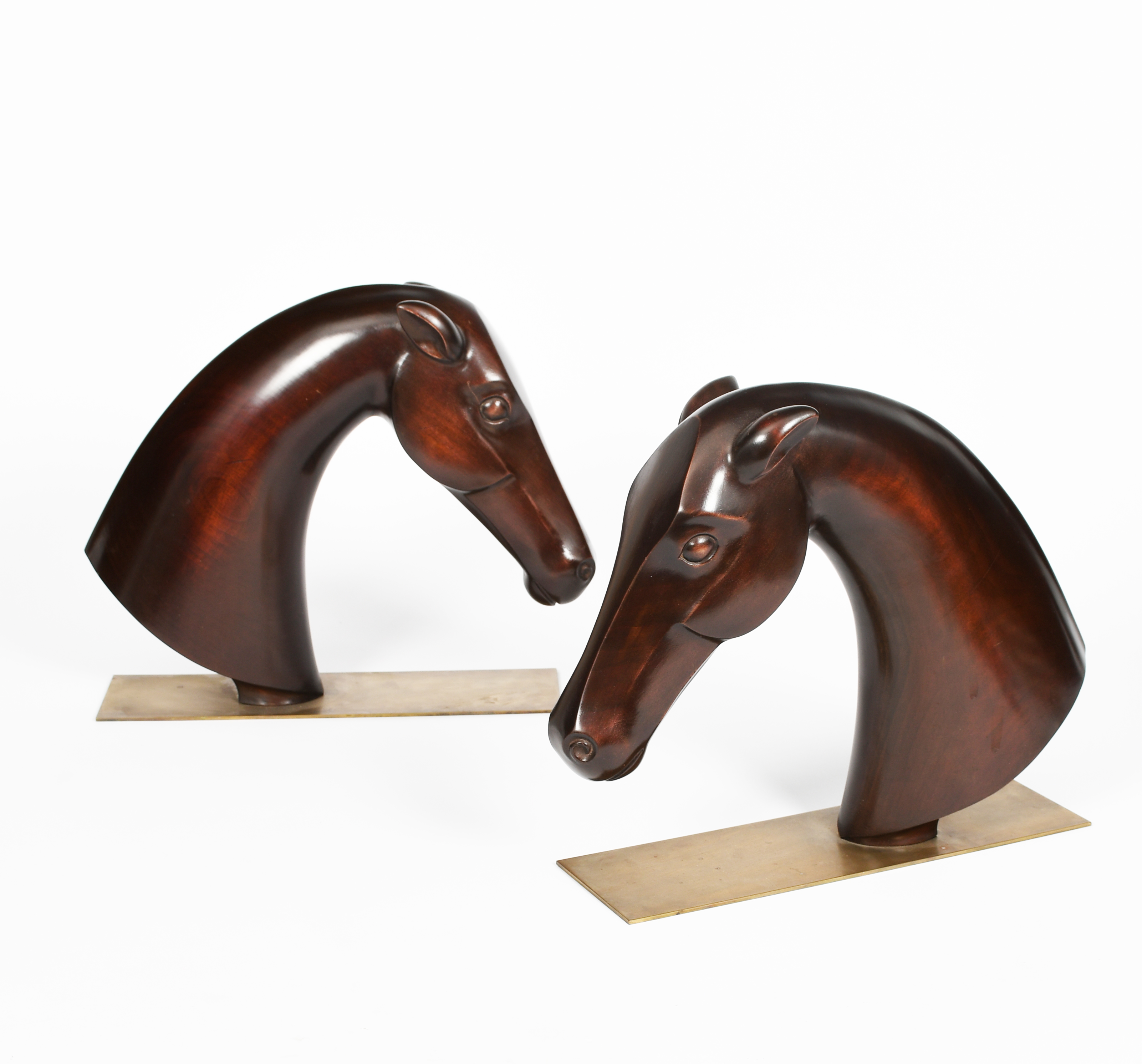 A pair of Hagenauer wooden busts of horses, on rectangular brass bases, stamped marks to base, 35cm. wide. (2)
