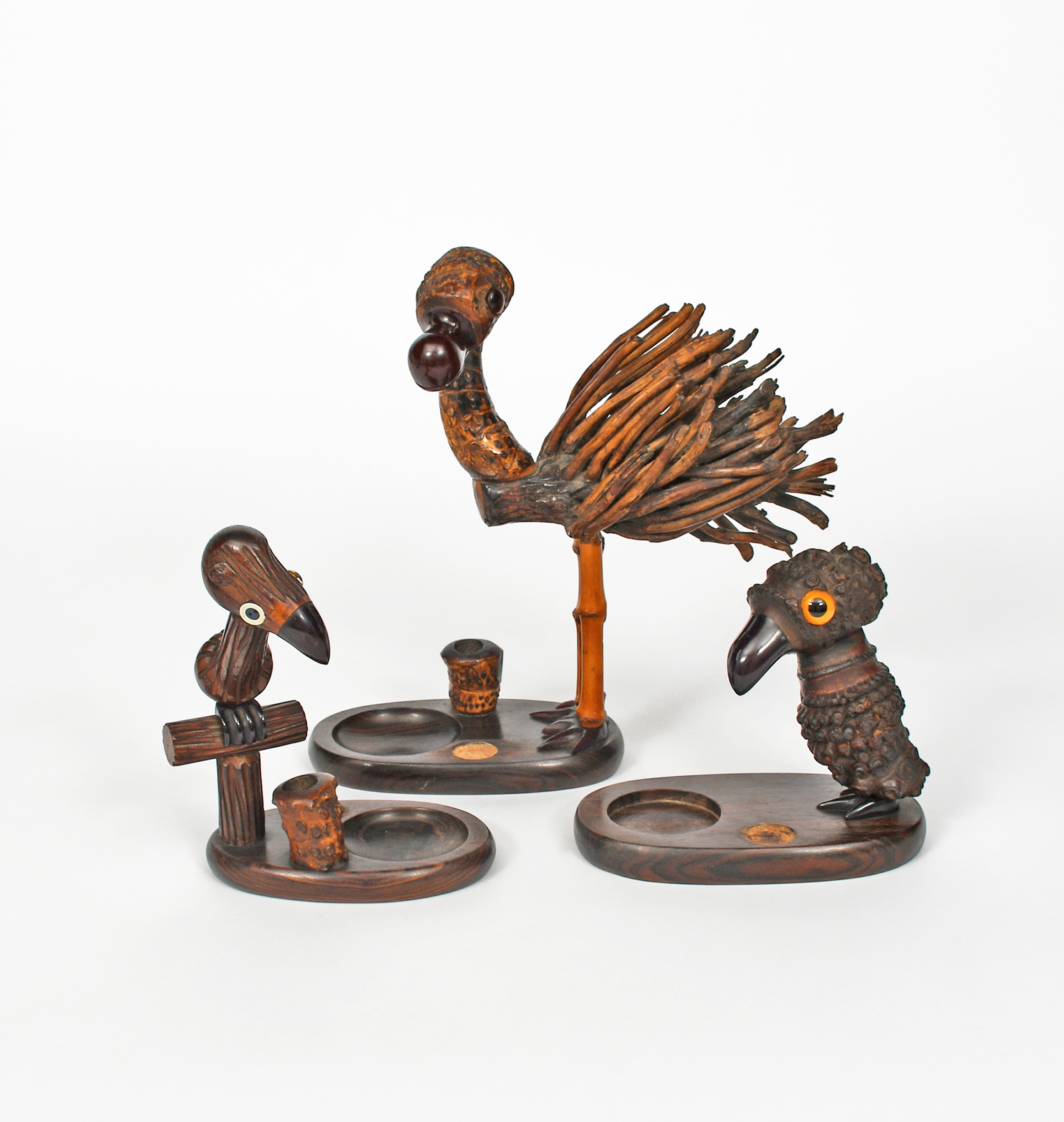 A Henry Howell & Co YZ bird, mixed exotic wood, bamboo and red phenol formaldehyde resin, modelled as a stylised ostrich, on Macassar ebony base, and two other YZ birds stamped YZ mark, 29cm. high, (3)