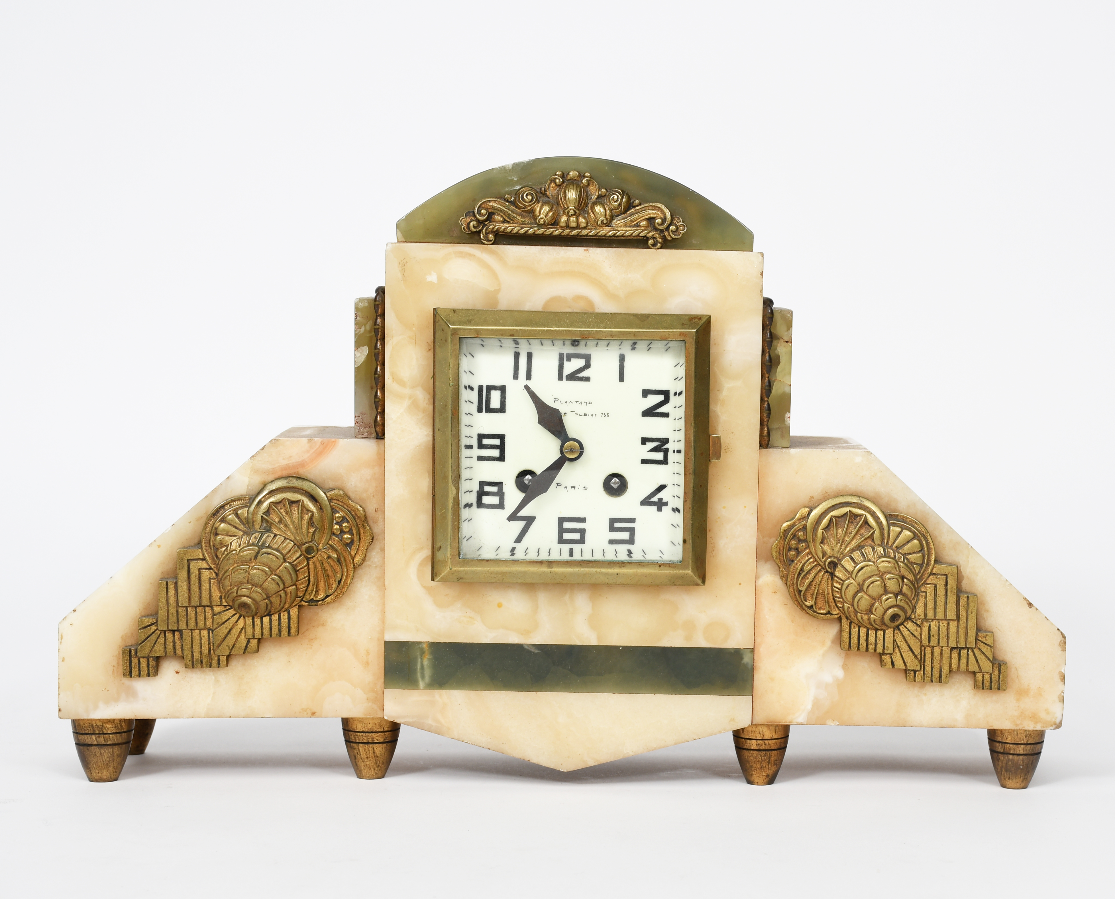 A French Art Deco onyx and bronze mantel clock, rectangular section on bronze bud feet, the onyx panelled body set with three stylised foliate panels, square section face with Arabic numerals, the dial signed Plantard Paris, 43.5cm. wide.