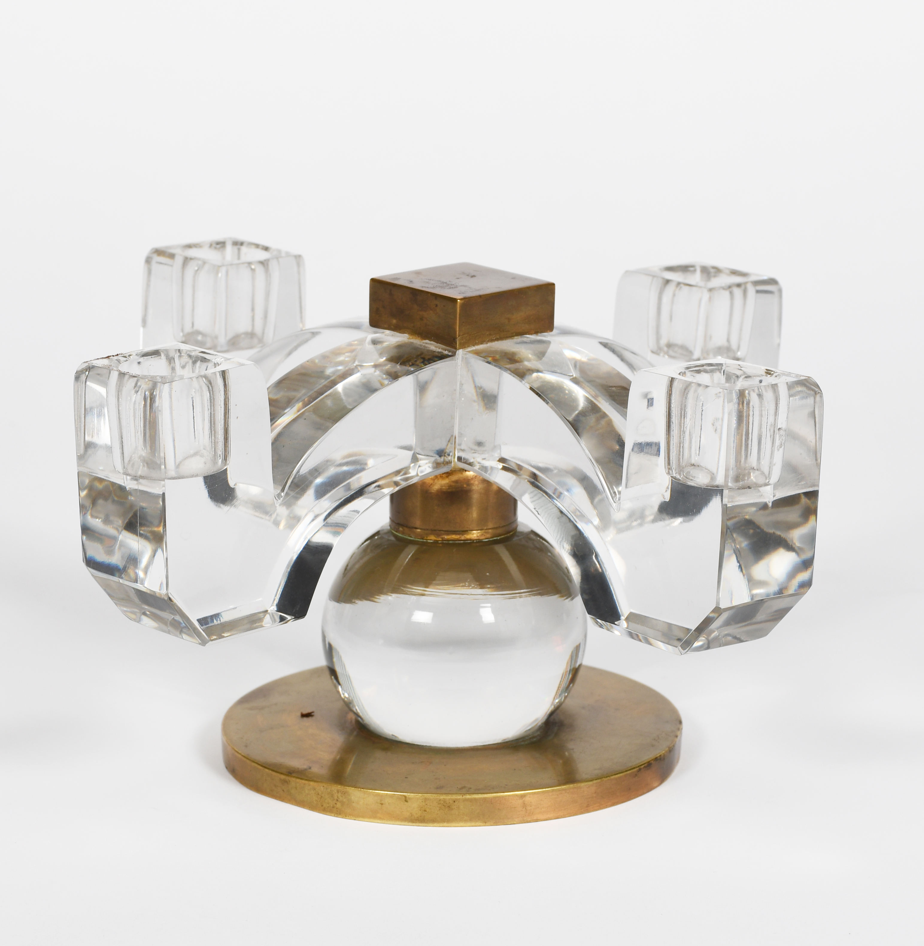 A bronze and glass candlestick designed by Jacques Adnet, cruciform, square section branches on spherical stem and circular bronze base, unsigned, 22cm. wide