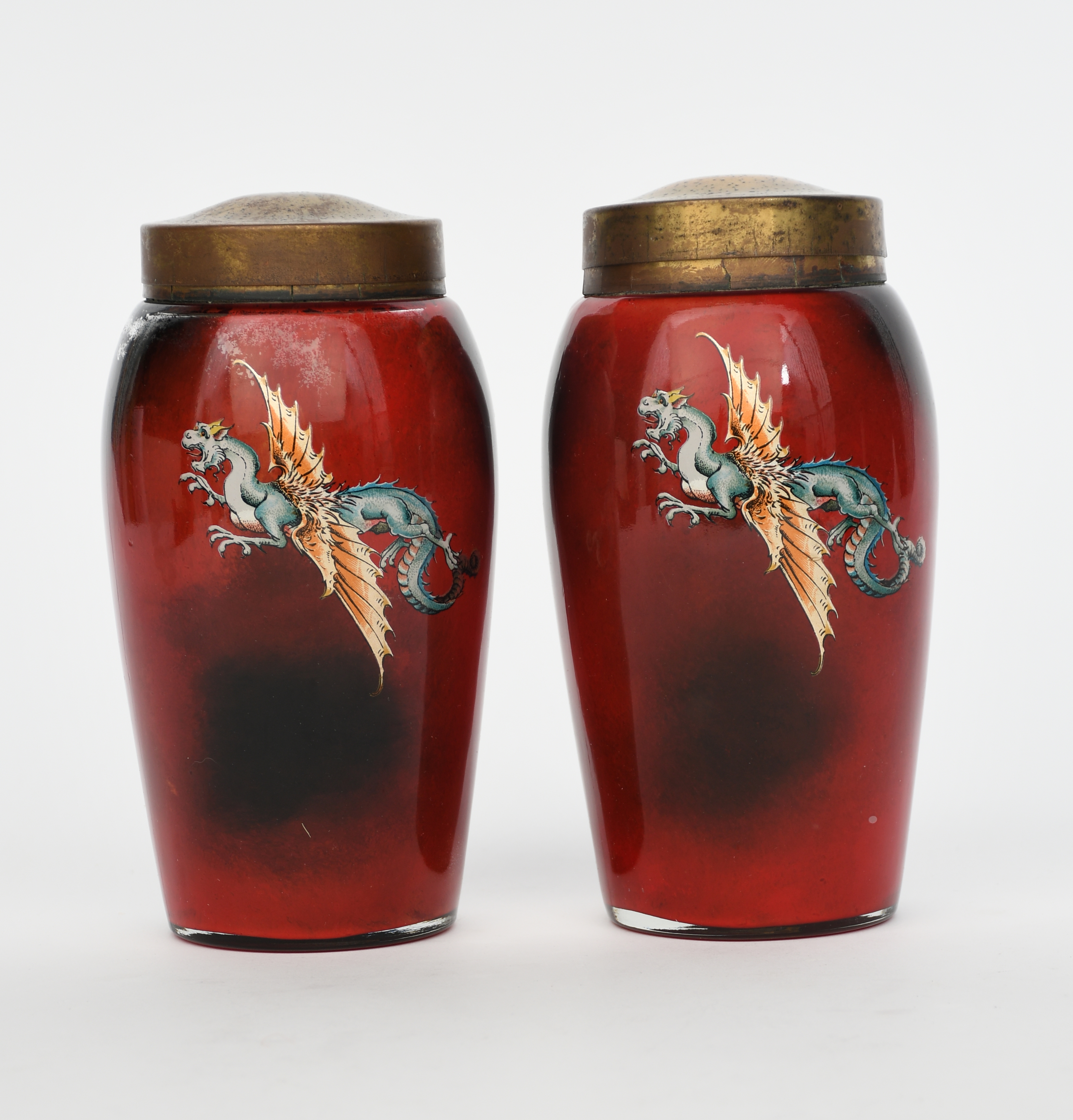 A pair of Decorative Glass Company Stourbridge glass caddies, reverse decorated with a mythical flying dragon on red ground, with metal rim and cover, factory mark to base, 19cm. high, (4)