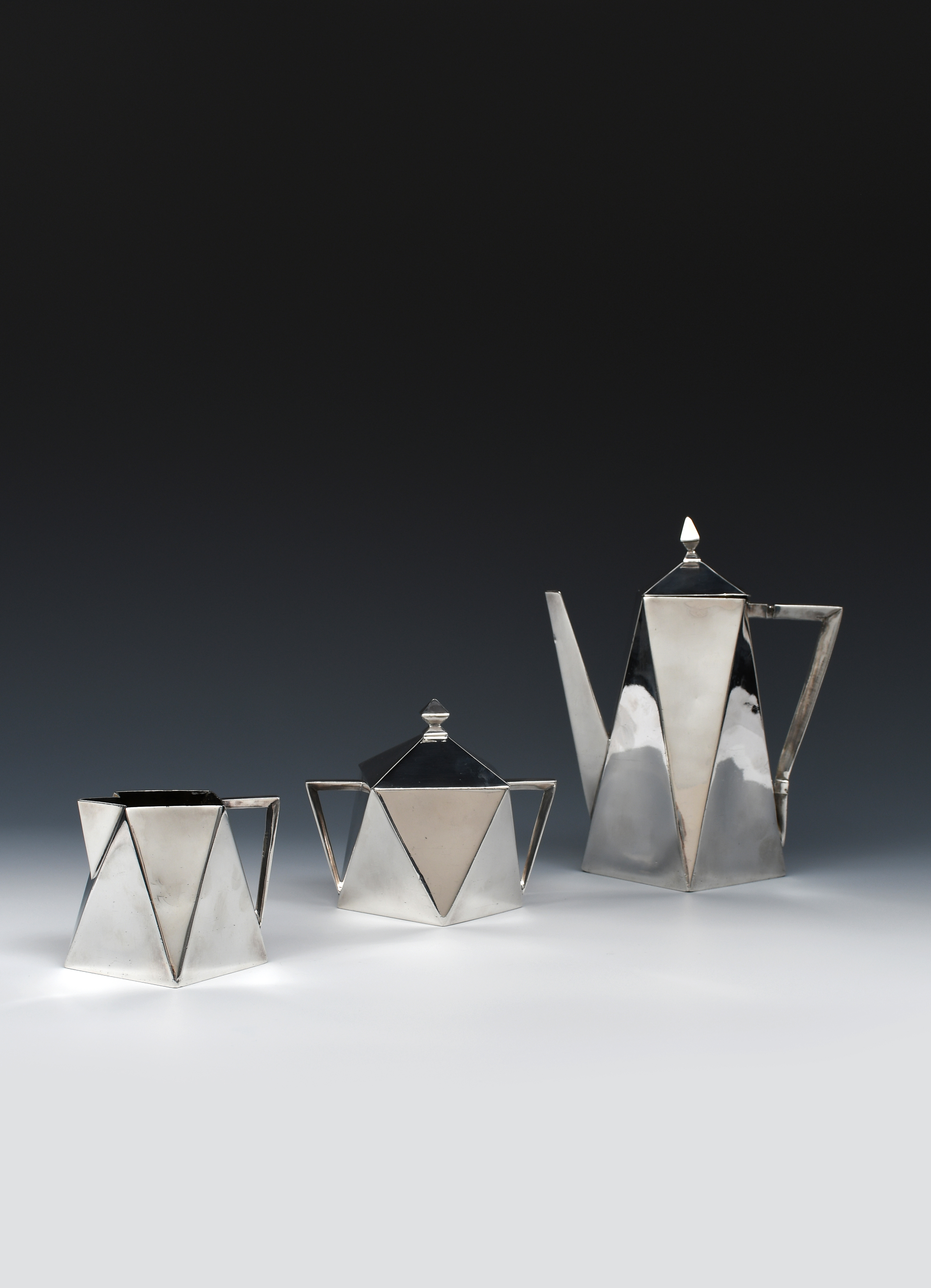 Jewel Stern Modernism in American Silver: 20th Century Design, New Haven page 28-30 for a comparable cubistic Lights and Shadows of Manhattan coffee service designed by Erik Magnussen.