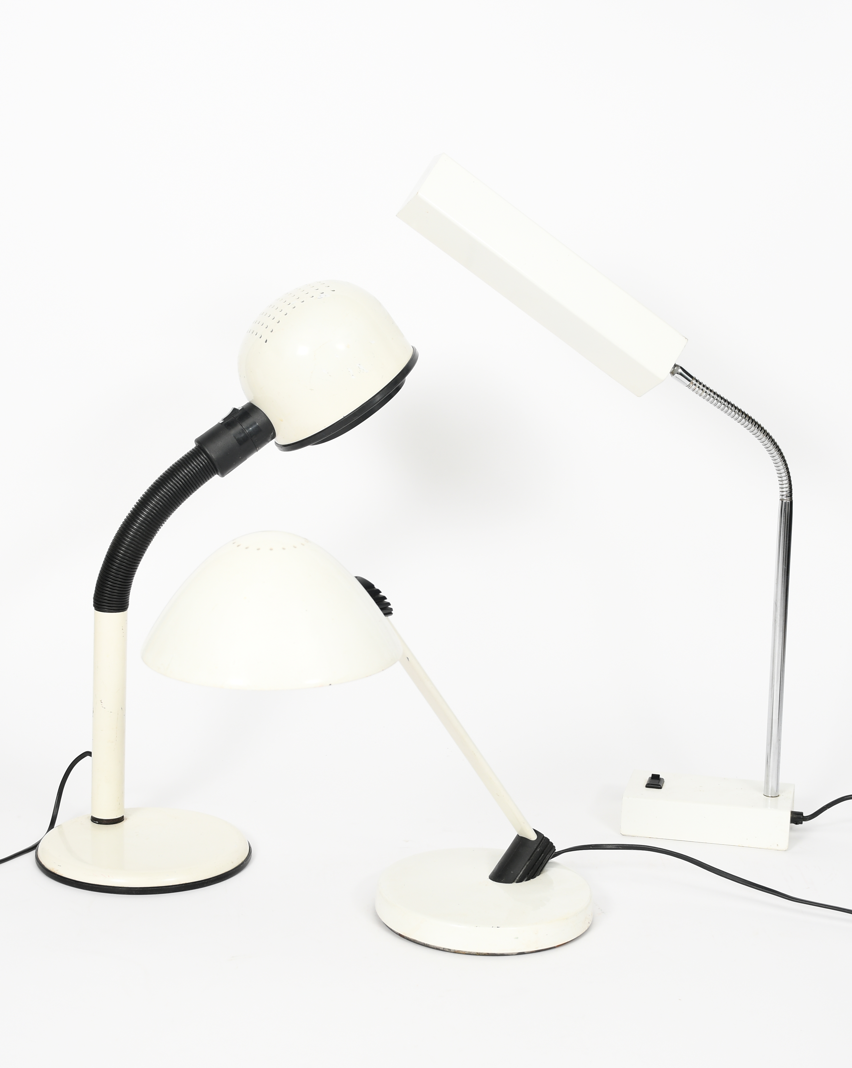 A Vrieland Holland enamelled metal table lamp, circular disk base with angled column and domed shade, white enamelled metal with black fittings, another Alda table lamp similar and a desk lamp with articulated chrome stem, main has paper label to inside of shade, 39cm. high, (3)