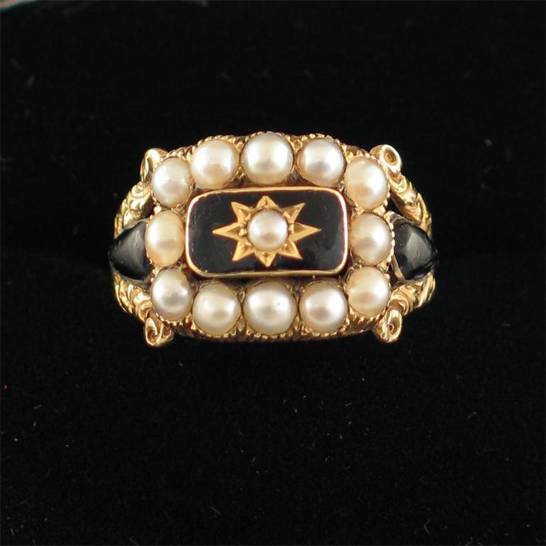 An early 19th Century mourning ring, set with seed pearls with black enamel decoration and bifurcated foliate shoulders. Size N1/2.