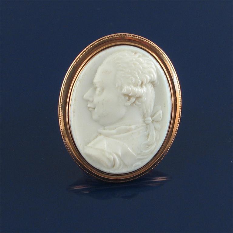 An 18th Century Tassie portrait ring, the gentleman looking left with wig. Gold oval mount with engraved shoulders.