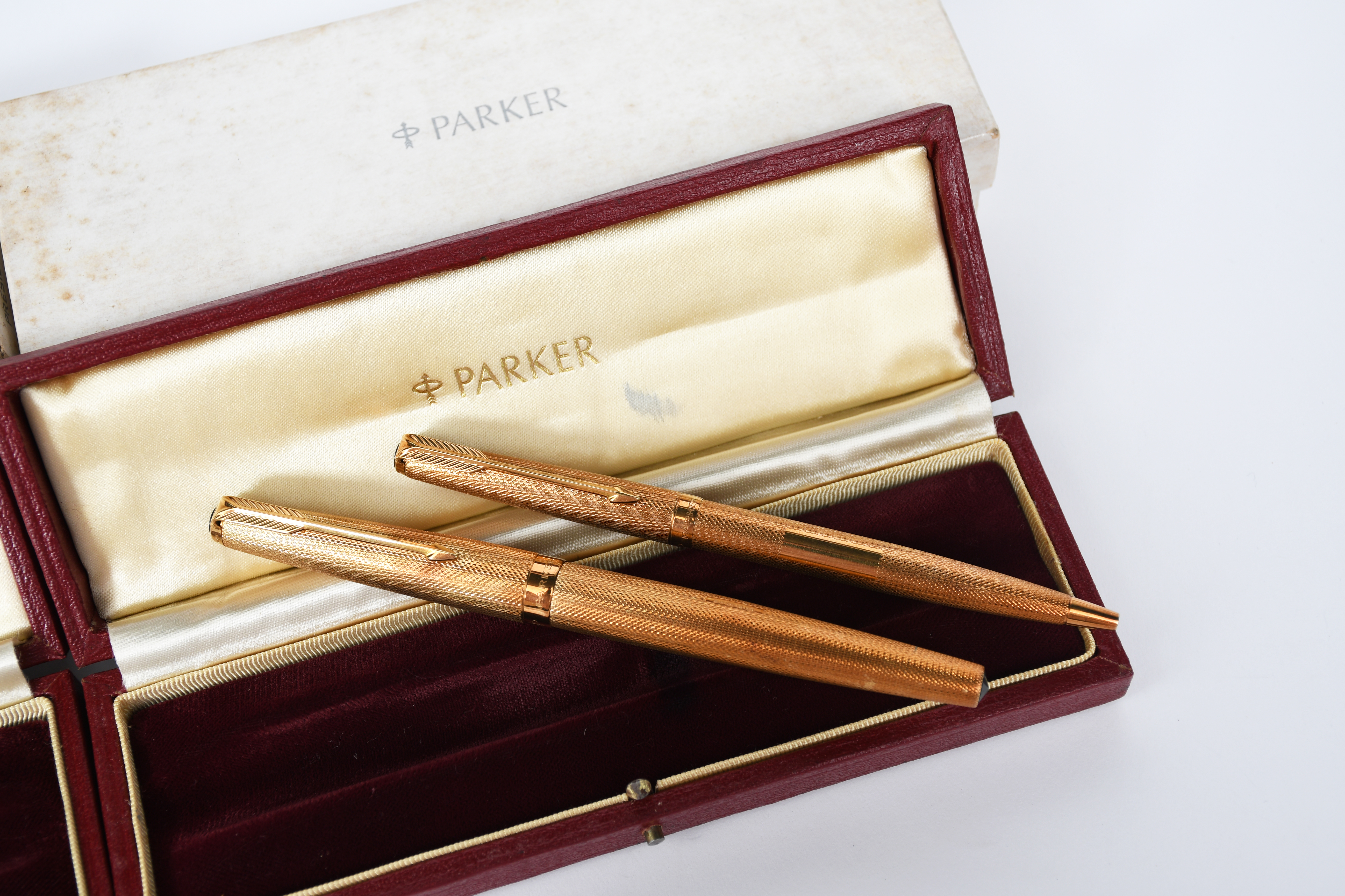 A Parker 61 Presidential 18ct gold fountain pen and ball pen, fine engine turned decoration, each in original fitted cases with card protector case, stamped marks, PP 750 London 1975 (fountain pen) 1974 (ball pen), 13.4cm. long, (2)