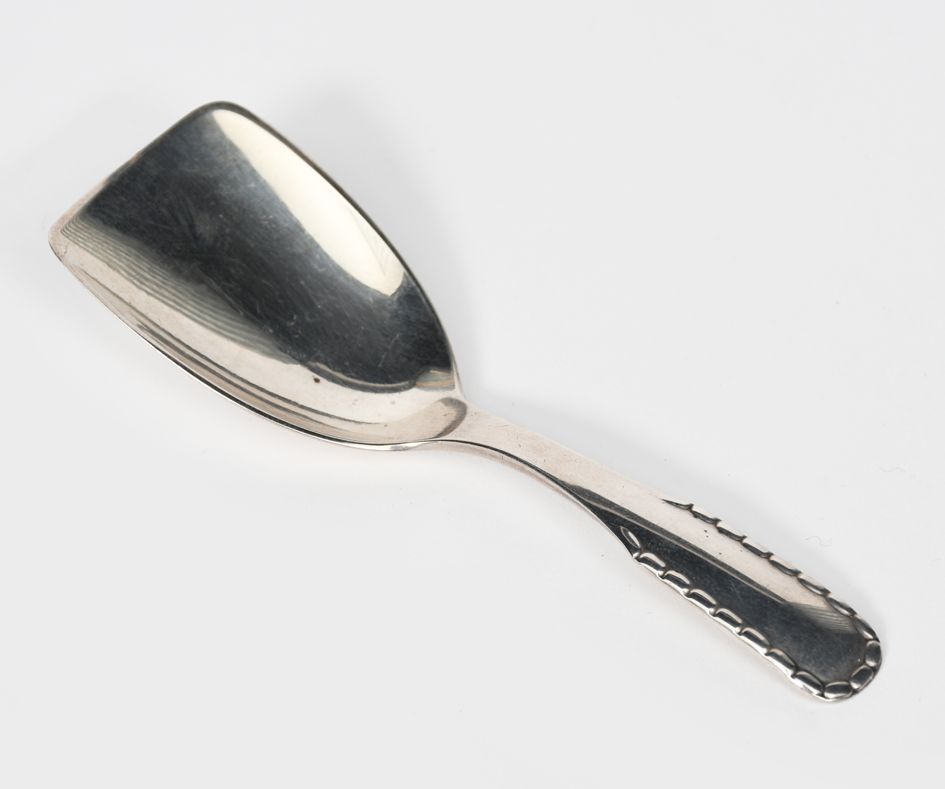 A Georg Jensen silver caddy spoon, with simple reeded decoration to the stem terminal, stamped marks, import marks, London 1928, 11cm. long