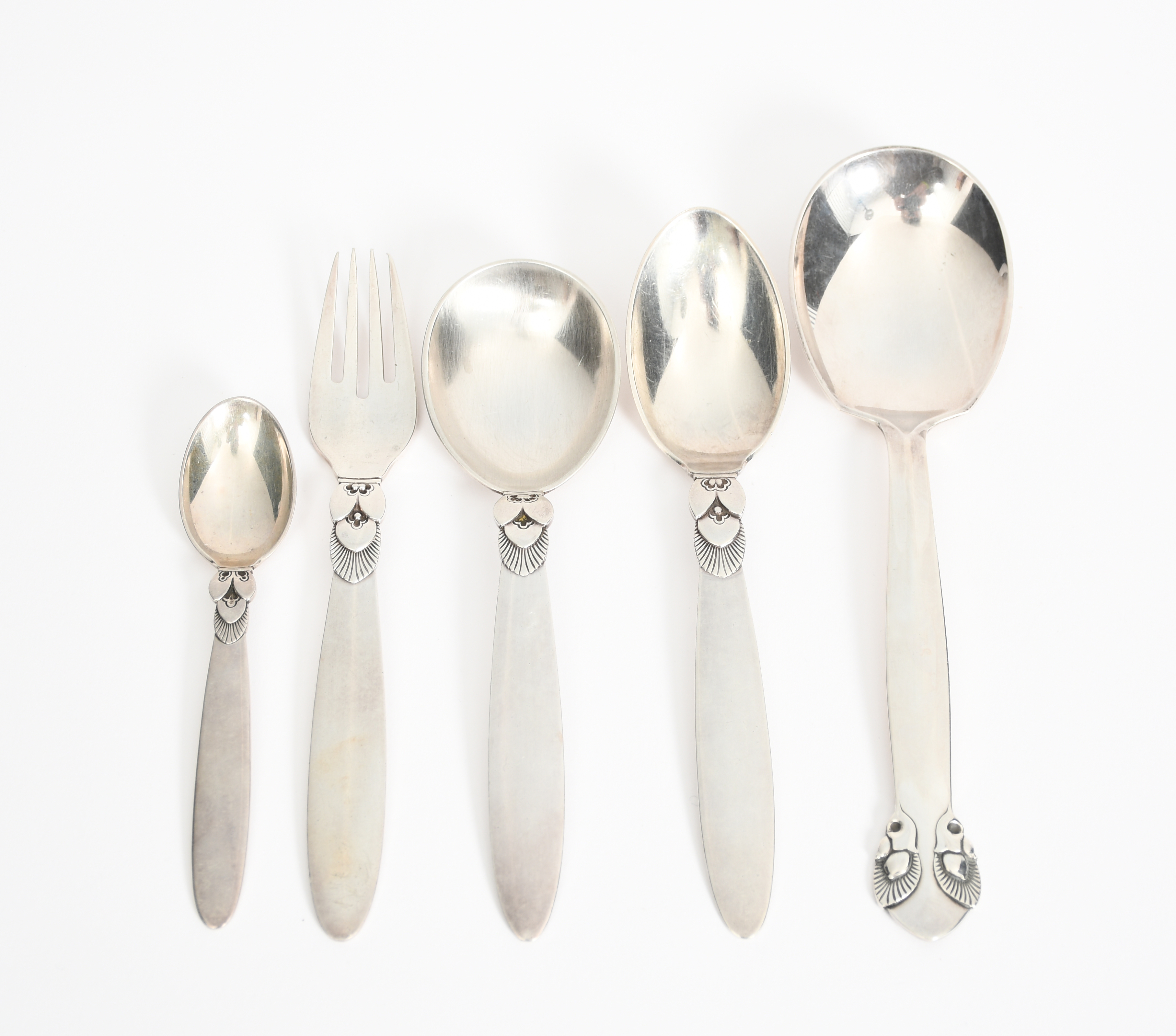 A Georg Jensen silver Cactus serving spoon designed by Gundolph Albertus, three other Cactus spoons and a fork, stamped marks, 16.5cm. long, 5.4ozt, (5)