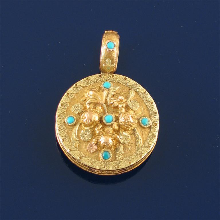 A Regency three colour gold circular locket pendant, chased decoration to both sides with flowers and set with small turquoise cabochons. Opening to reveal a glazed locket compartment (one section cracked). 2.2cm diameter.
