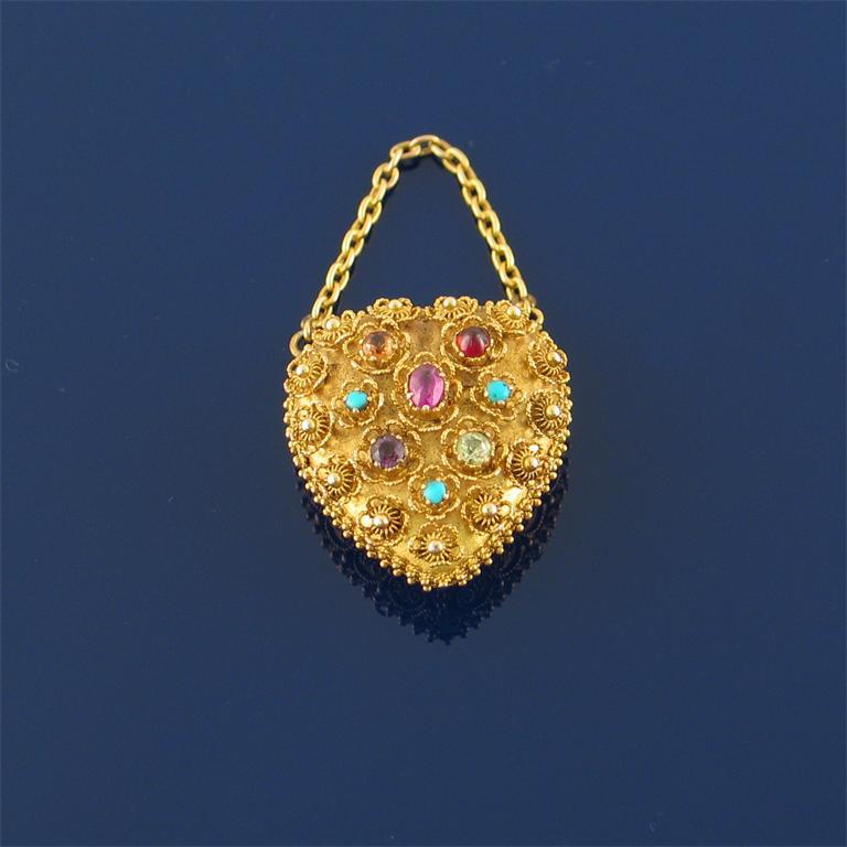 A Regency gold heart form locket pendant, cannetille decoration to both sides, the cover set with gem stones opening to reveal glazed locket compartment containing plaited hair. With fine link chain. 2.5cm high.