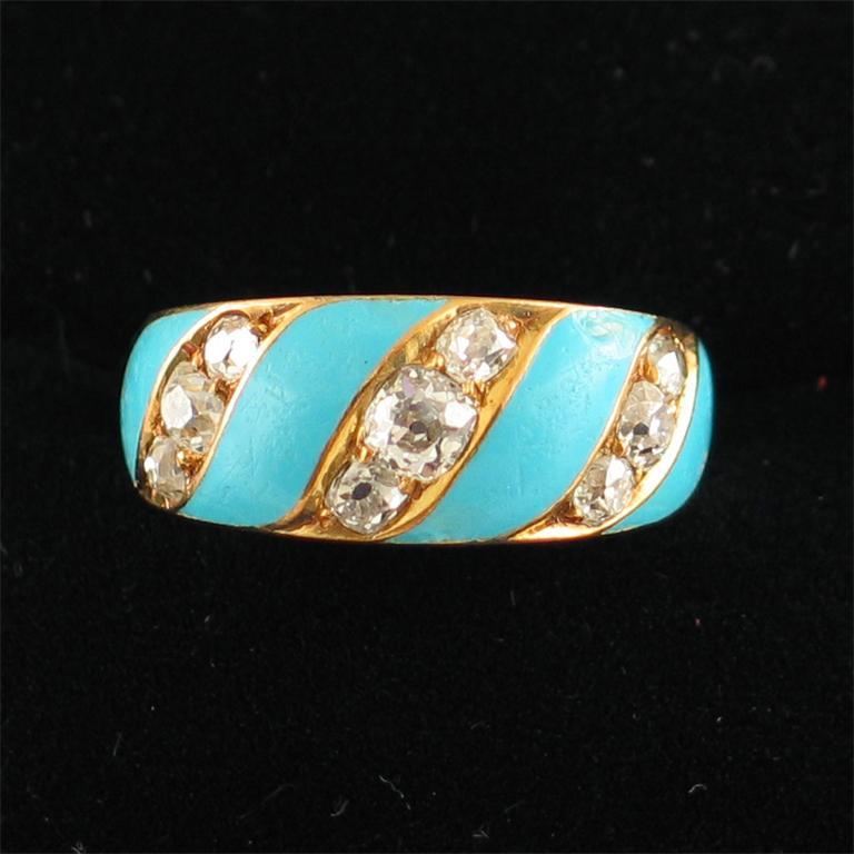 An 18ct yellow gold ring, decorated with scrolling lines of three graduated diamonds alternating with bars of light blue enamel. Size N.
