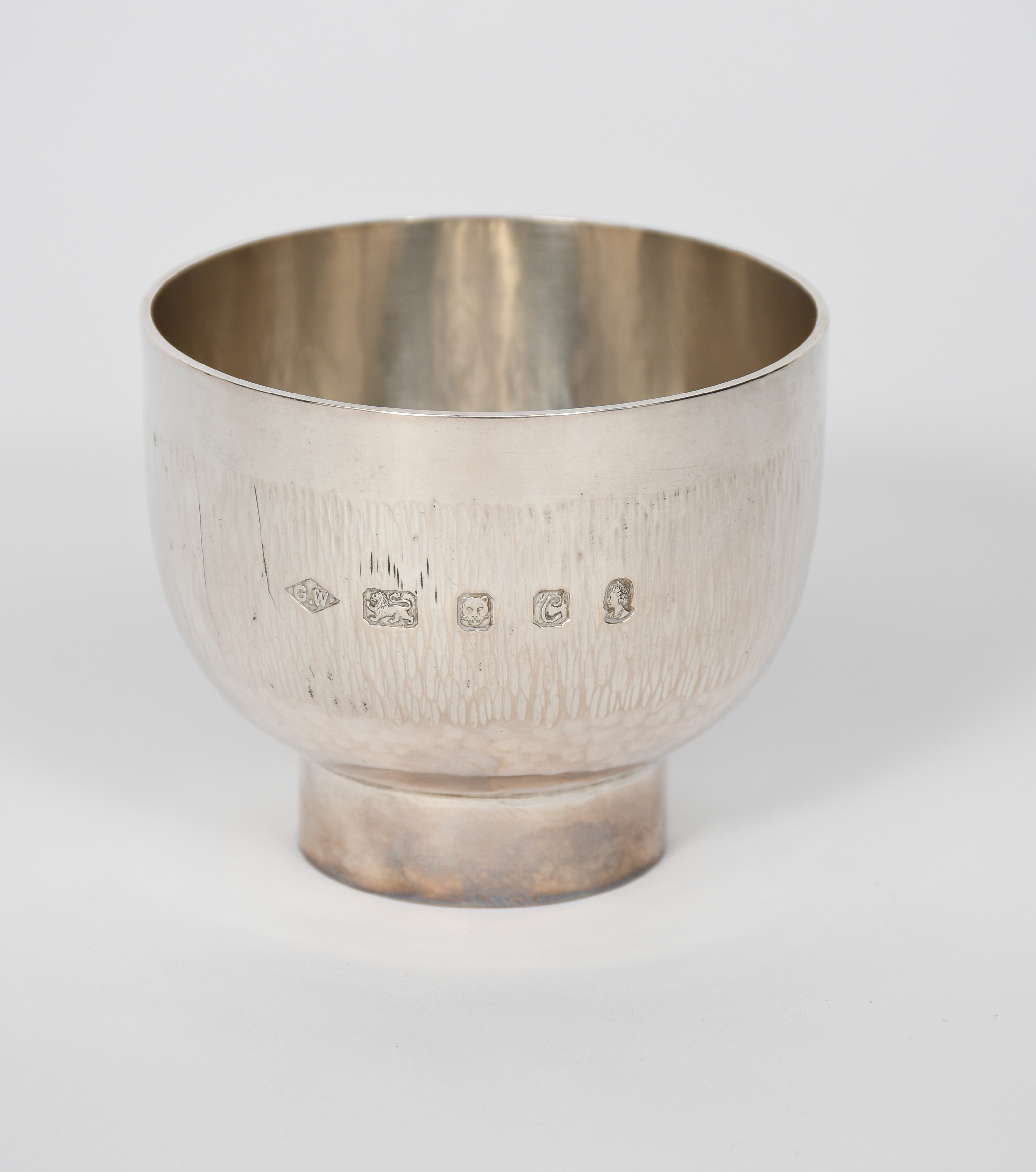 A Graham Watling silver cup, drum foot supporting textured bowl with hammered interior, stamped marks, GW London 1977, 6.5cm. high, 5.7ozt