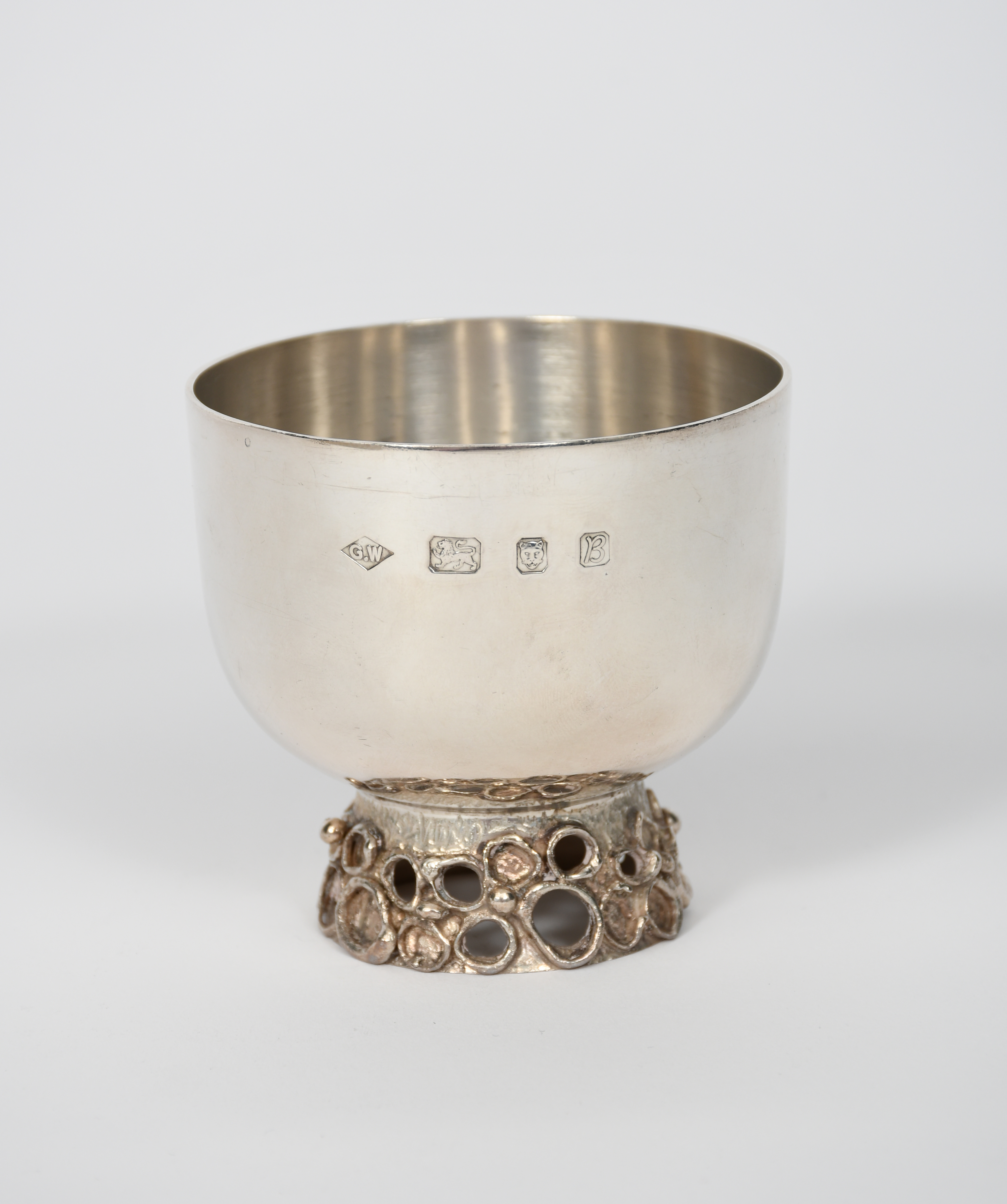 A Graham Watling silver cup, on pierced cast textured foot, a simple bowl, stamped marks GW London 1976, 7.5cm. high, 5ozt