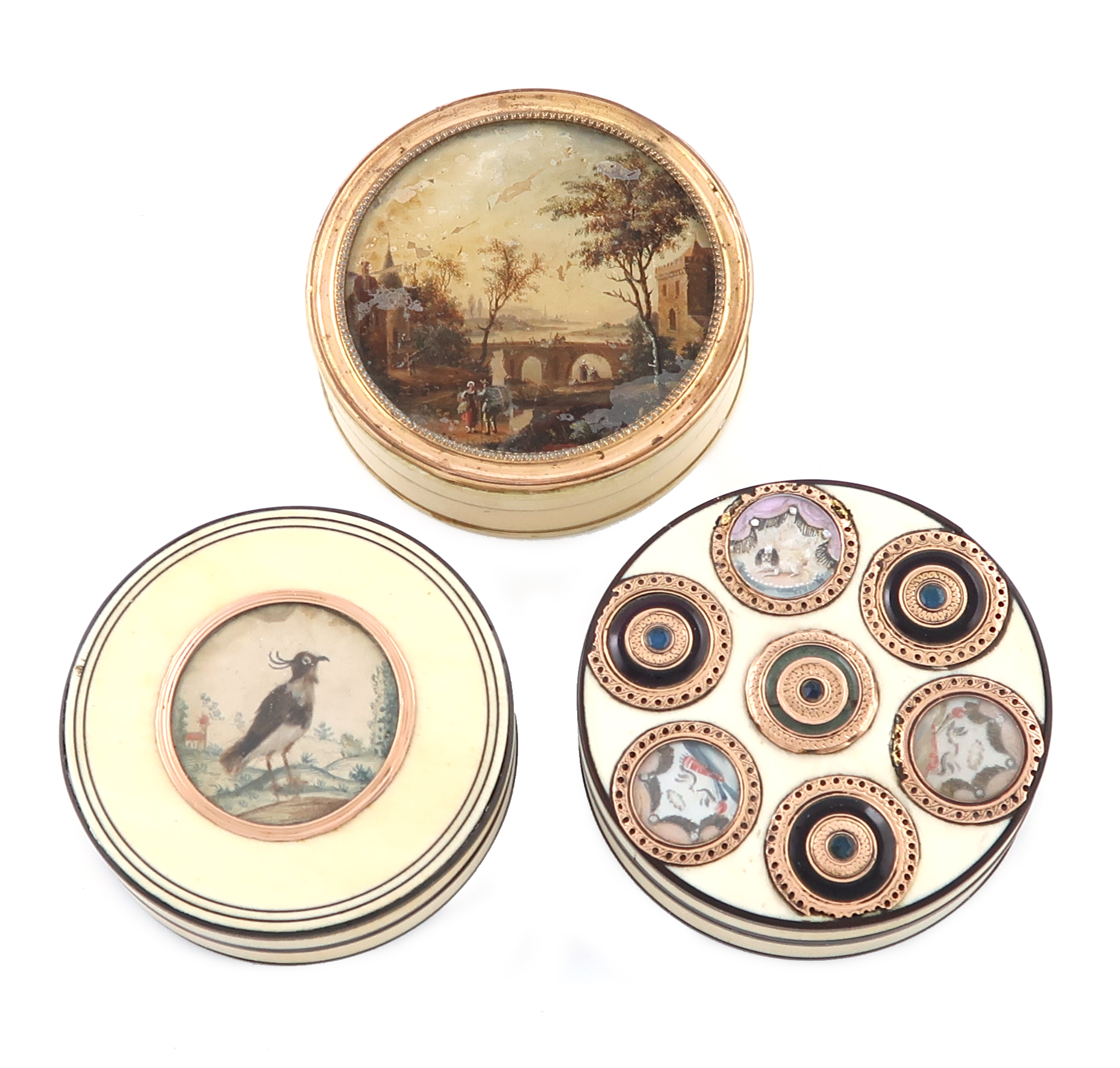 circular form, tortoiseshell banding and lining, the cover applied with seven gold-mounted circular plaques with various scenes, plus a similar box, the cover set with a scene of a bird under glass, gold mount ,and another box, the cover with a landscape scene under glass, diameters 8cm, 7.5cm and 7.9cm. (3)