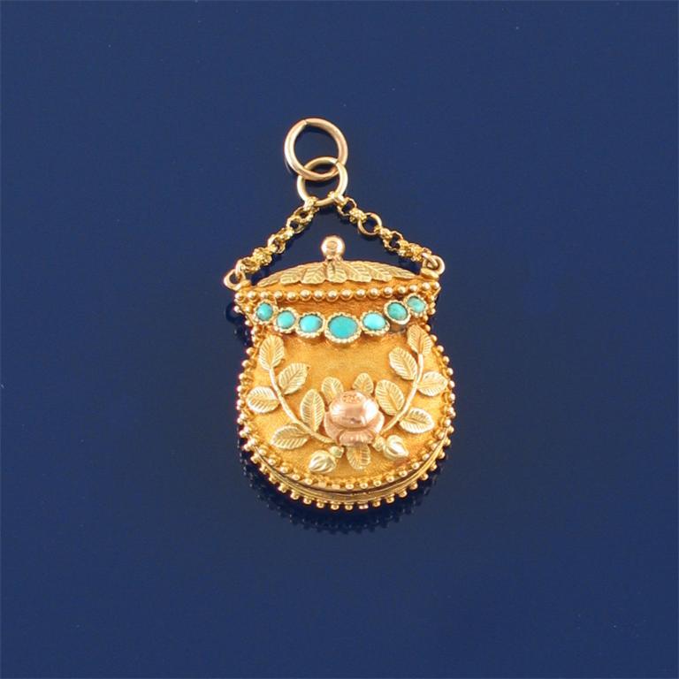 A Regency three colour gold bag form vinaigrette pendant, realistically formed and applied with roses to a matted ground with pellet border and swags of graduated turquoise cabochons, suspended from a granulated chain. Foliate pierced hinged grille to the vinaigrette. 2.2cm high. French mark.