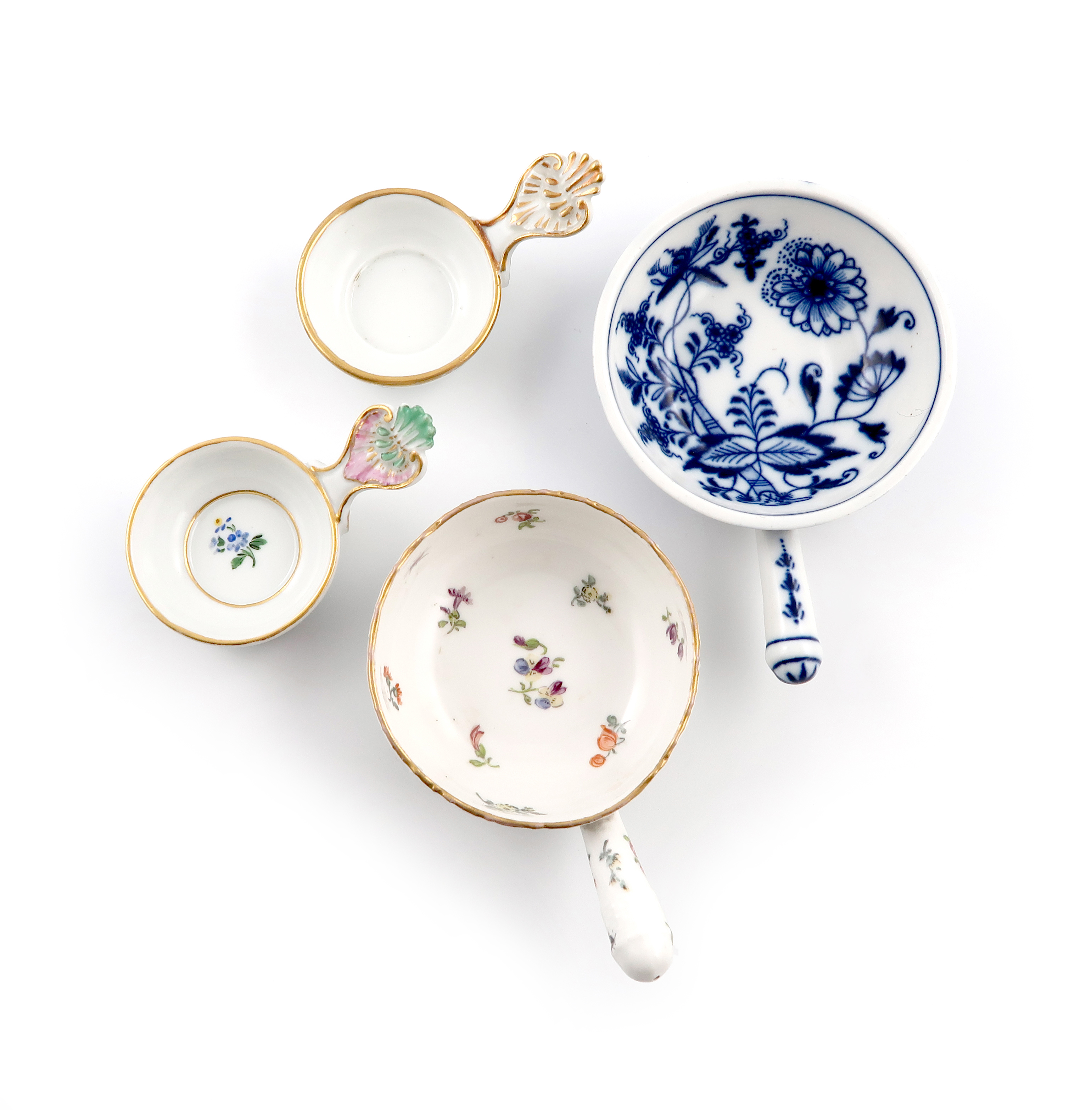 Four German porcelain wine tasters , 19th century, the two smaller Meissen and painted with small sprigs of deutscheBlumen, another Meissen and painted in underglaze blue with the Onion pattern or Zweibelmuster, the last Berlin and painted with polychrome flower sprays on an osier-moulded ground, blue crossed swords and sceptre marks, 13.2cm max. (4)
